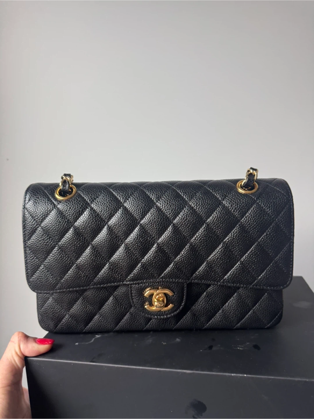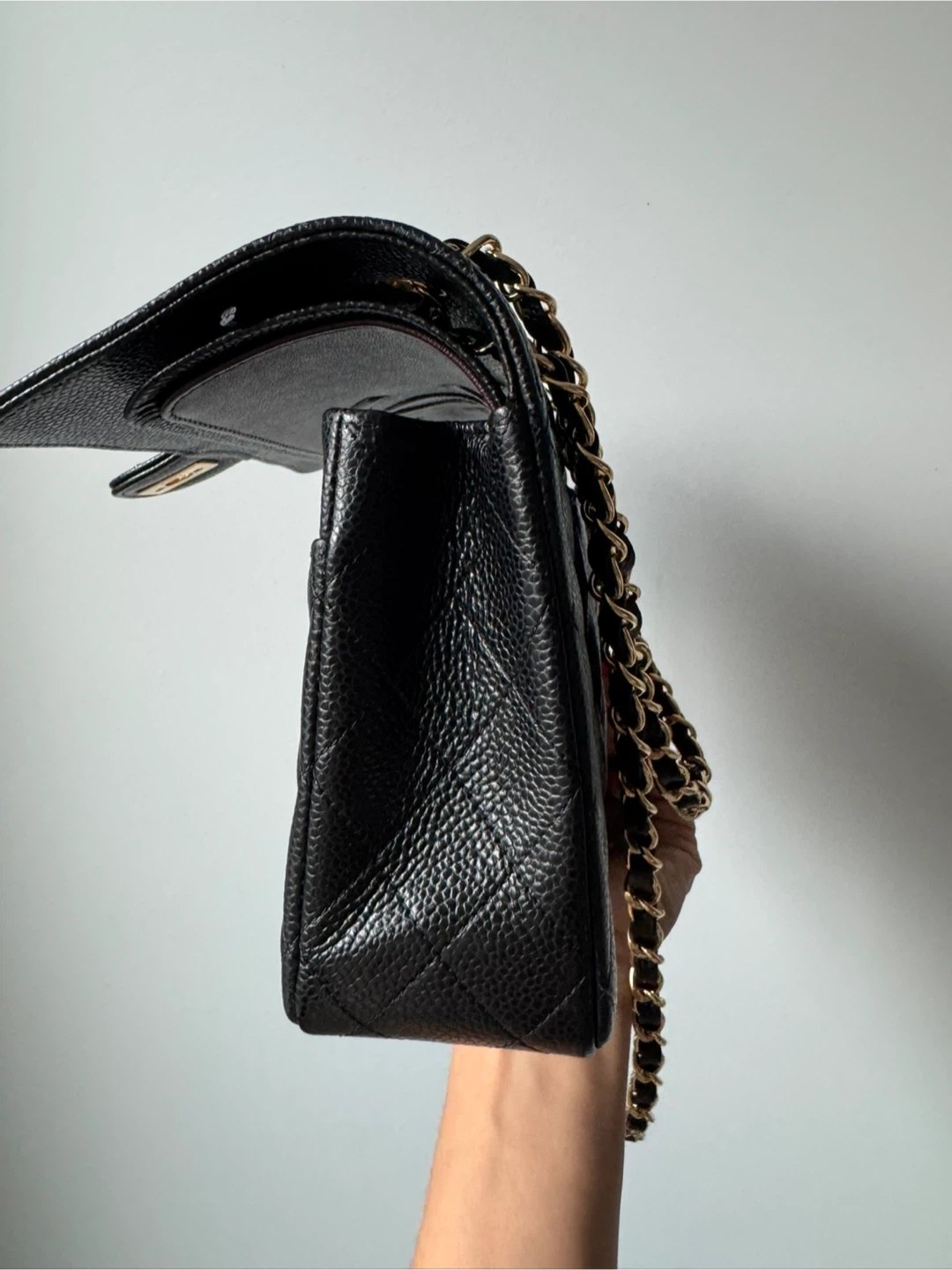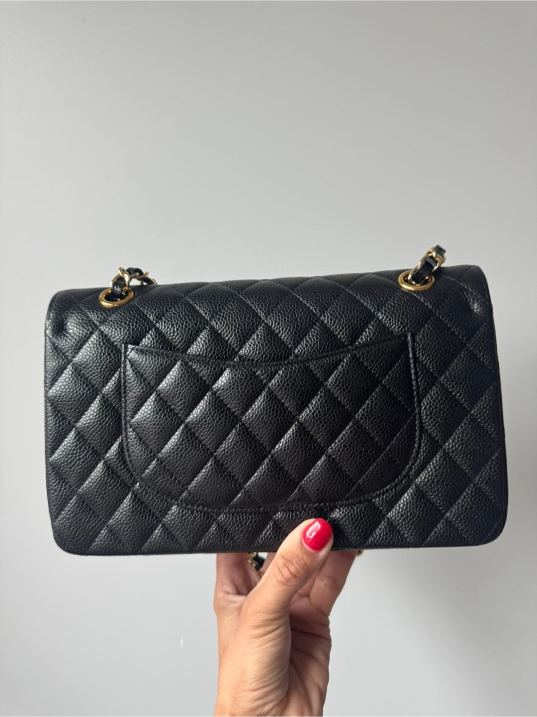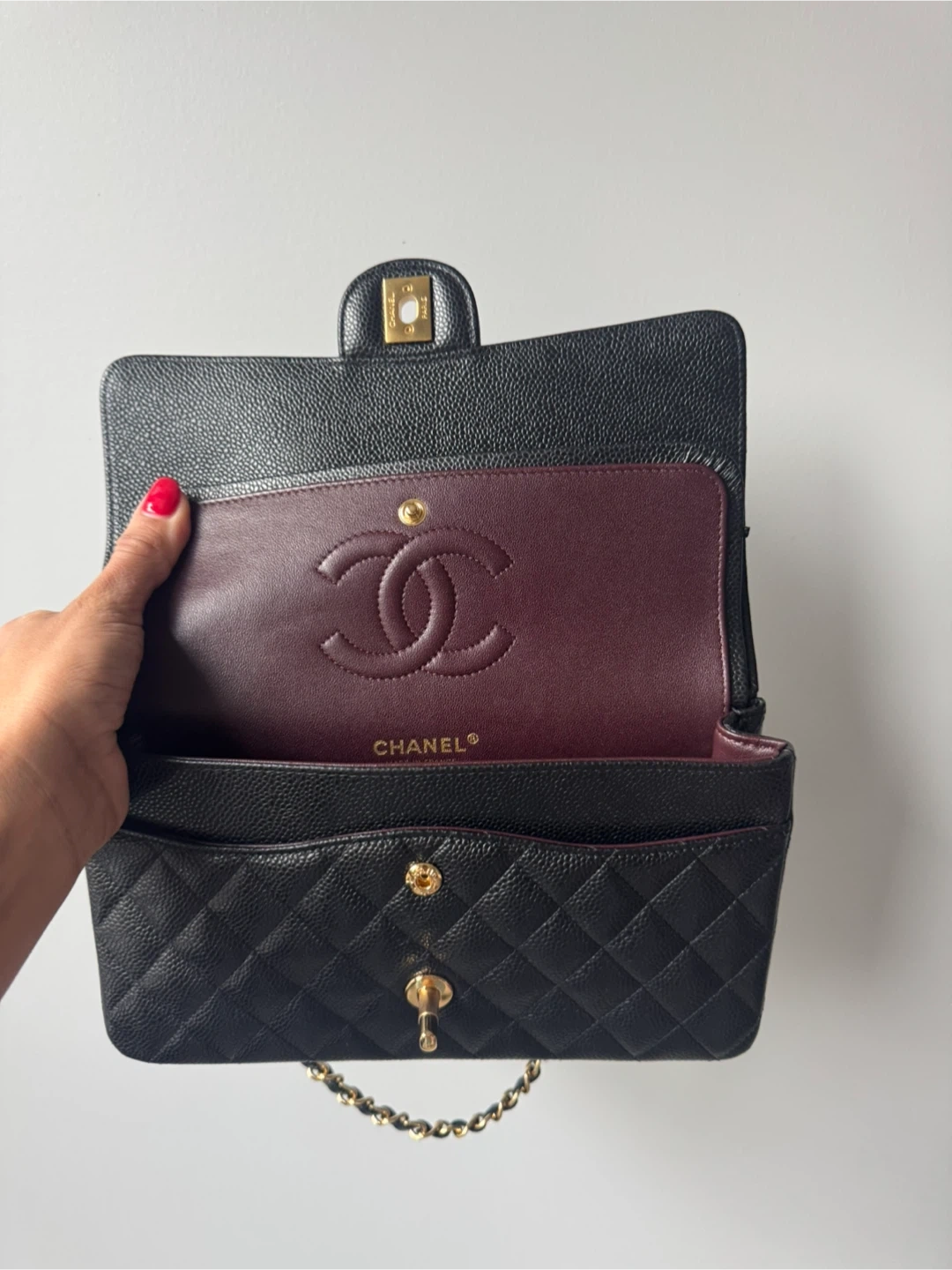 Classic inspired black caviar leather Chanel flap bag with gold hardware. Features the iconic quilted pattern and signature interlocking CC logo. Interior is a deep burgundy. This bag is a timeless accessory for any occasion!