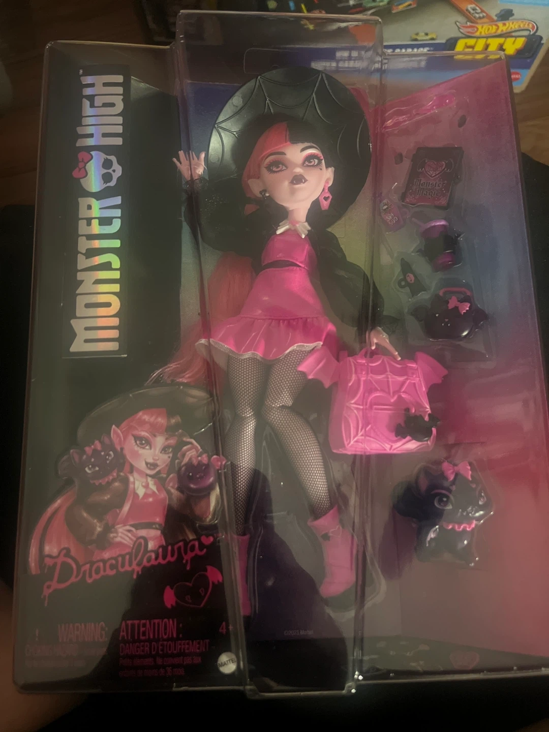 This is a Monster High Draculaura doll in her original packaging. It includes accessories like a handbag and pets. This doll is suitable for ages 4 and up. Retail $40