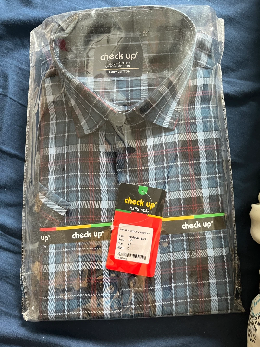 Two formal shirts from Check Up. One is a plaid pattern in blues and greys, and the other is a small checkered pattern in tan and white. Both are made of luxury cotton. This is men's wear, size H:S and 42.