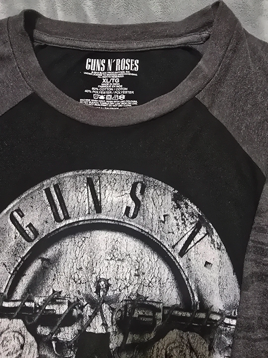 Guns N' Roses raglan t-shirt in black and grey. Made with 60% cotton and 40% polyester. Features the band's classic logo on the front. Size is XL/TG.