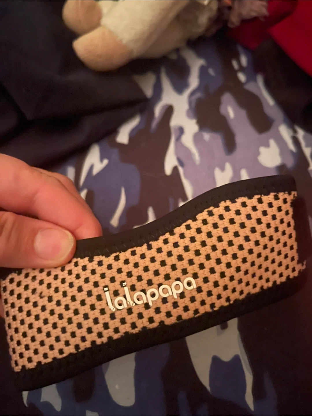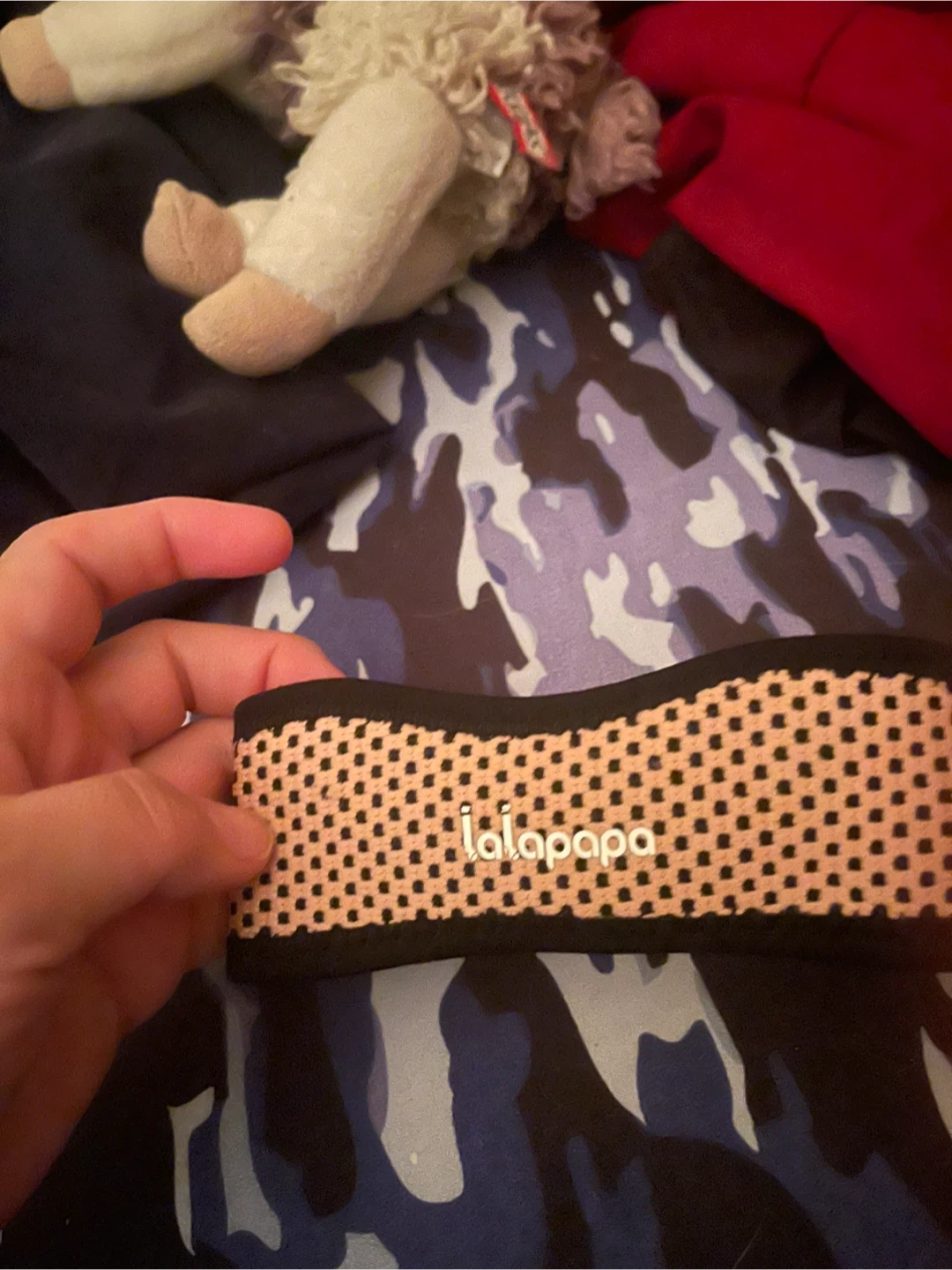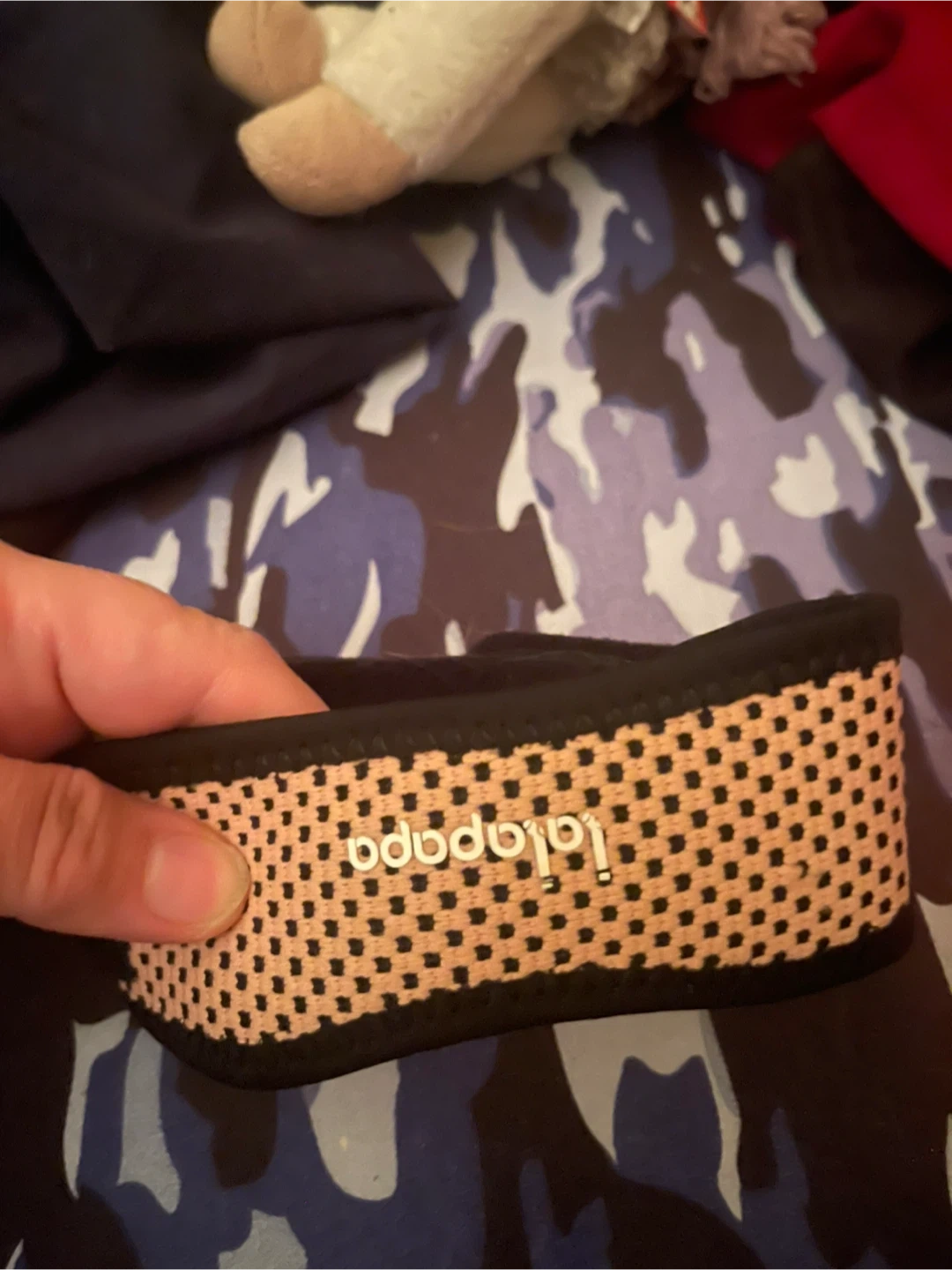 This Lalapapa wrist band features a beige and black patterned design. It's made of a stretchy, comfortable material. It's suitable for active use or everyday wear.