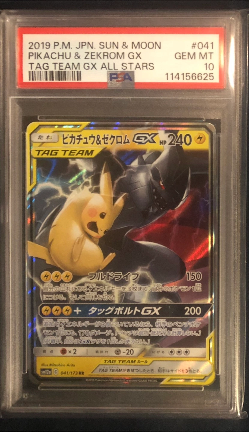 This is a 2019 Pokemon Sun & Moon "Pikachu & Zekrom GX" Tag Team All Stars card. It's a Japanese exclusive and has been professionally graded as GEM MT 10. This card is a great addition for any serious collector!