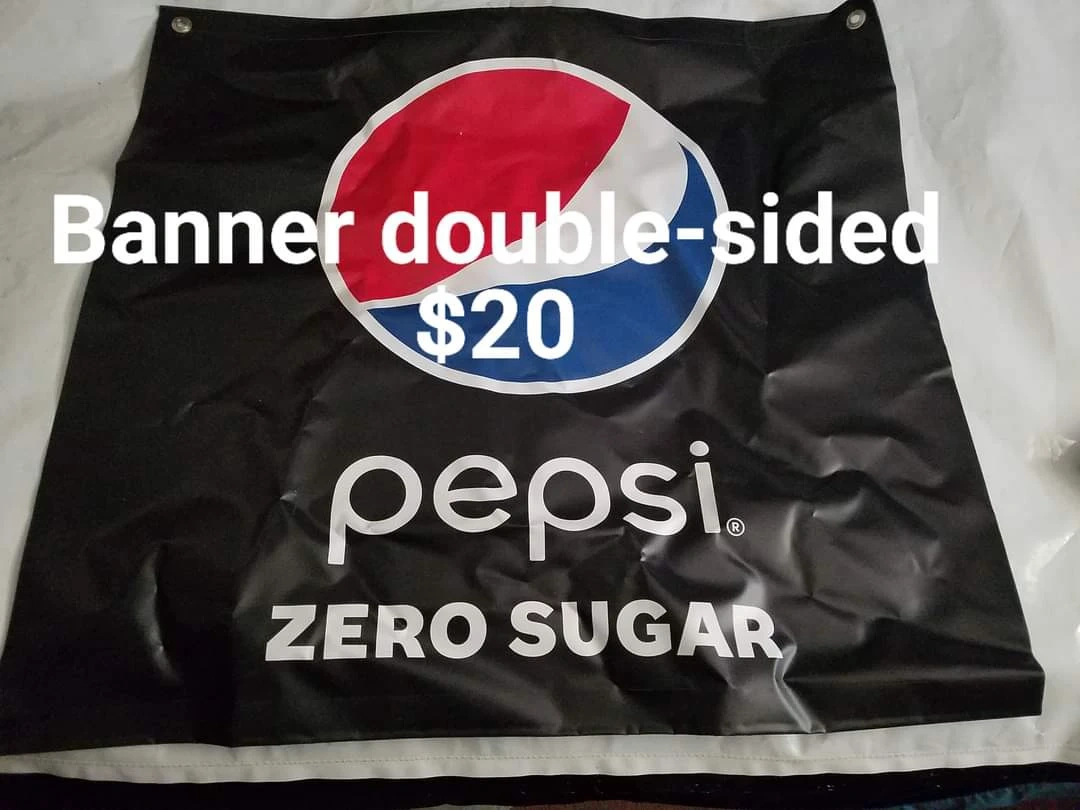 Pepsi Zero Sugar double-sided banner featuring the classic logo and text. It's made for display and includes grommets for hanging. Great for a store, man cave, or event!