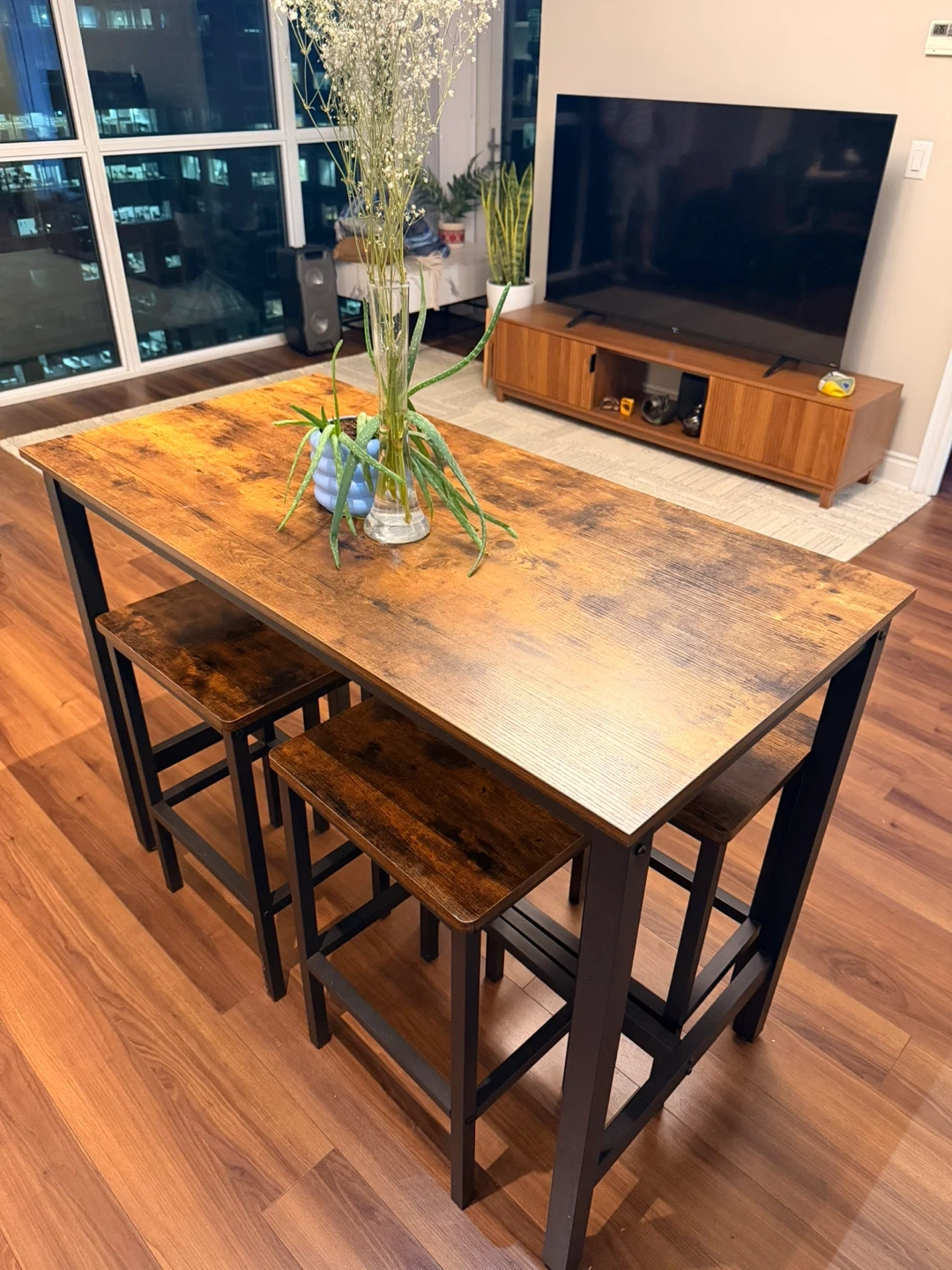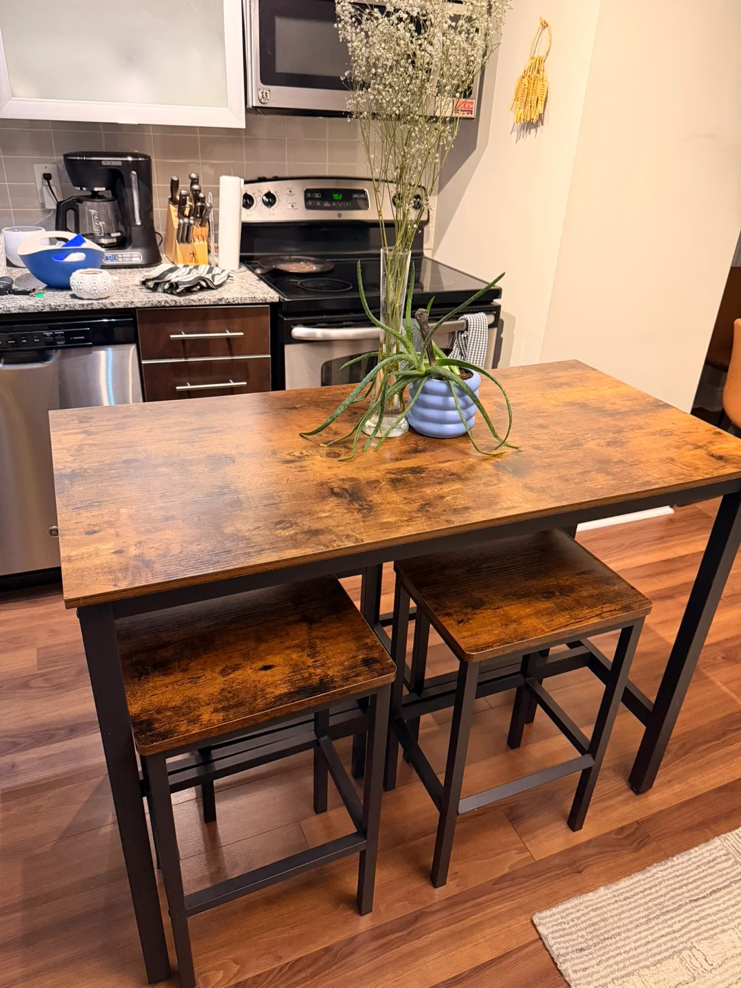 This bar table and stool set features a rustic wood tabletop with a black metal frame. It's perfect for smaller spaces like apartments or kitchens and works as island. The set includes one table and four stools.