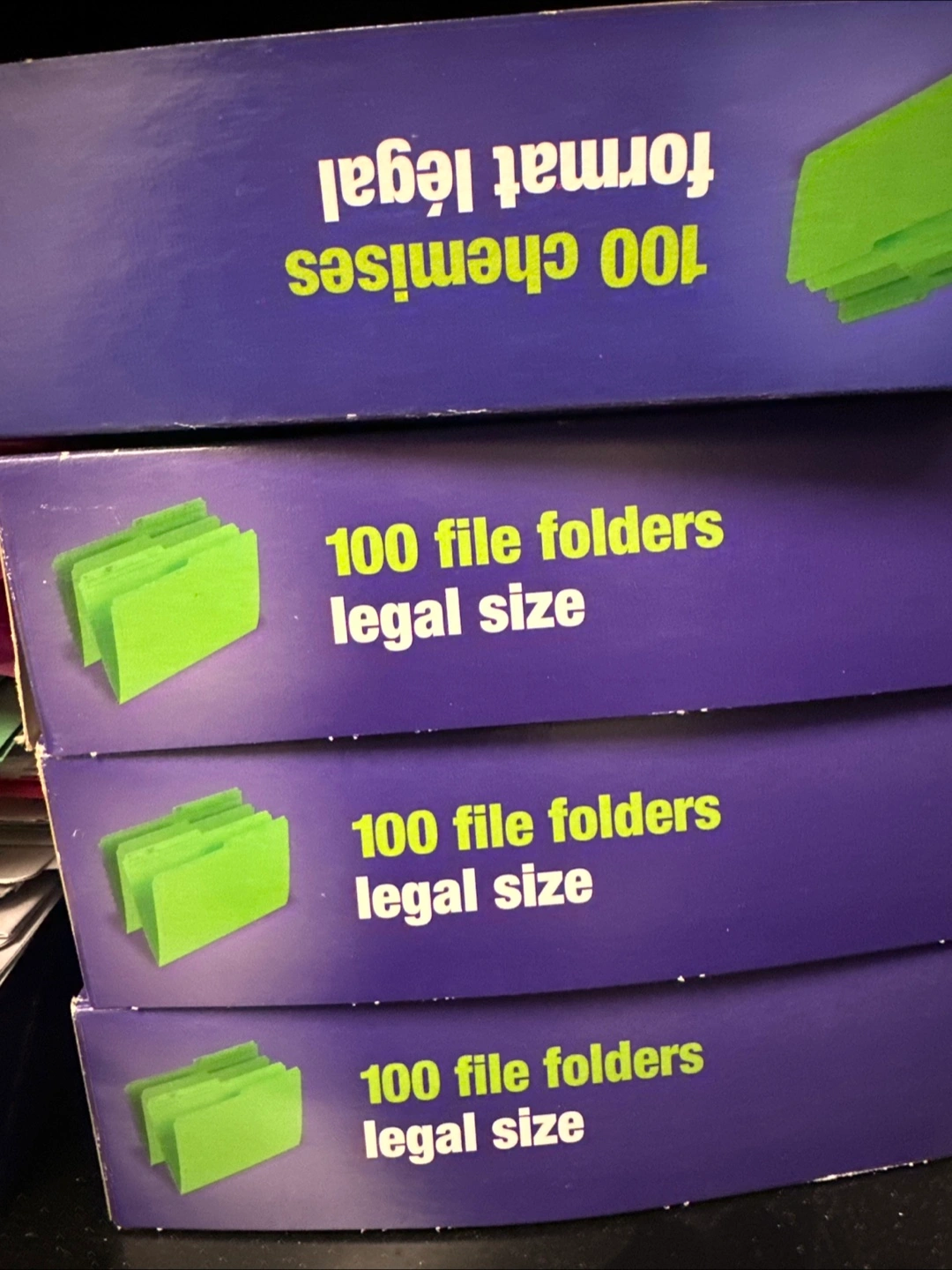 Legal and Letter sized file folders. Bright green and other colors. Perfect for organizing documents.
