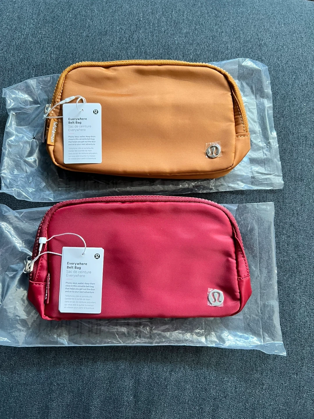 Two Lululemon Everywhere Belt Bags in orange and red. These versatile belt bags are designed to keep your phone, keys, and wallet close.