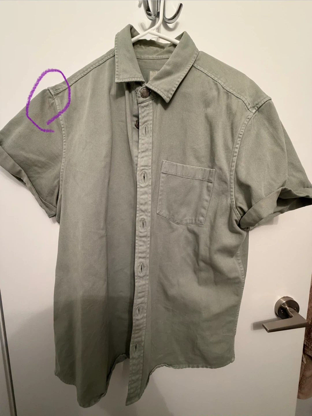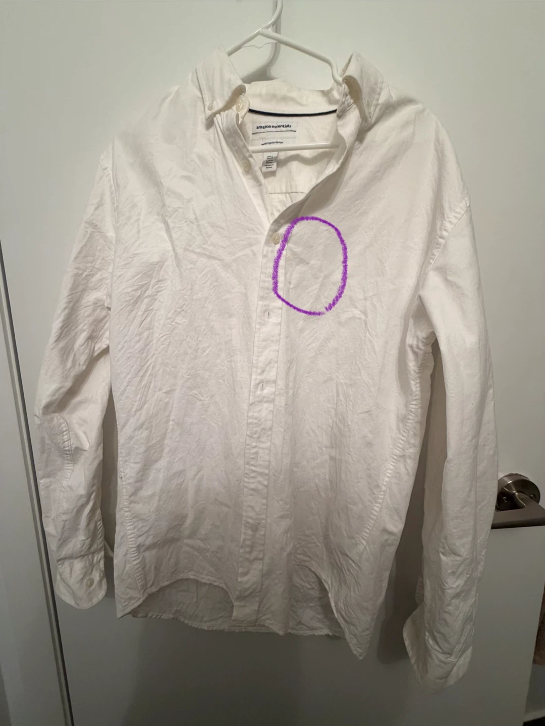 Bundle of four men's dress shirts. Includes a short-sleeve olive green shirt, a periwinkle blue dress shirt by George, a white casual button-up by Amazon Essentials, and a blue button-down shirt by Joseph & Feiss.