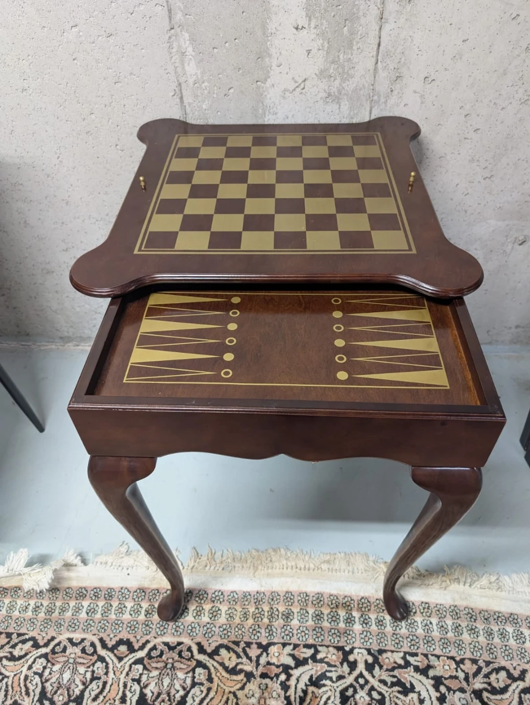 This is a beautiful dark wood chess and backgammon table! It's in perfect condition and would be a lovely addition to any game room or living space.
