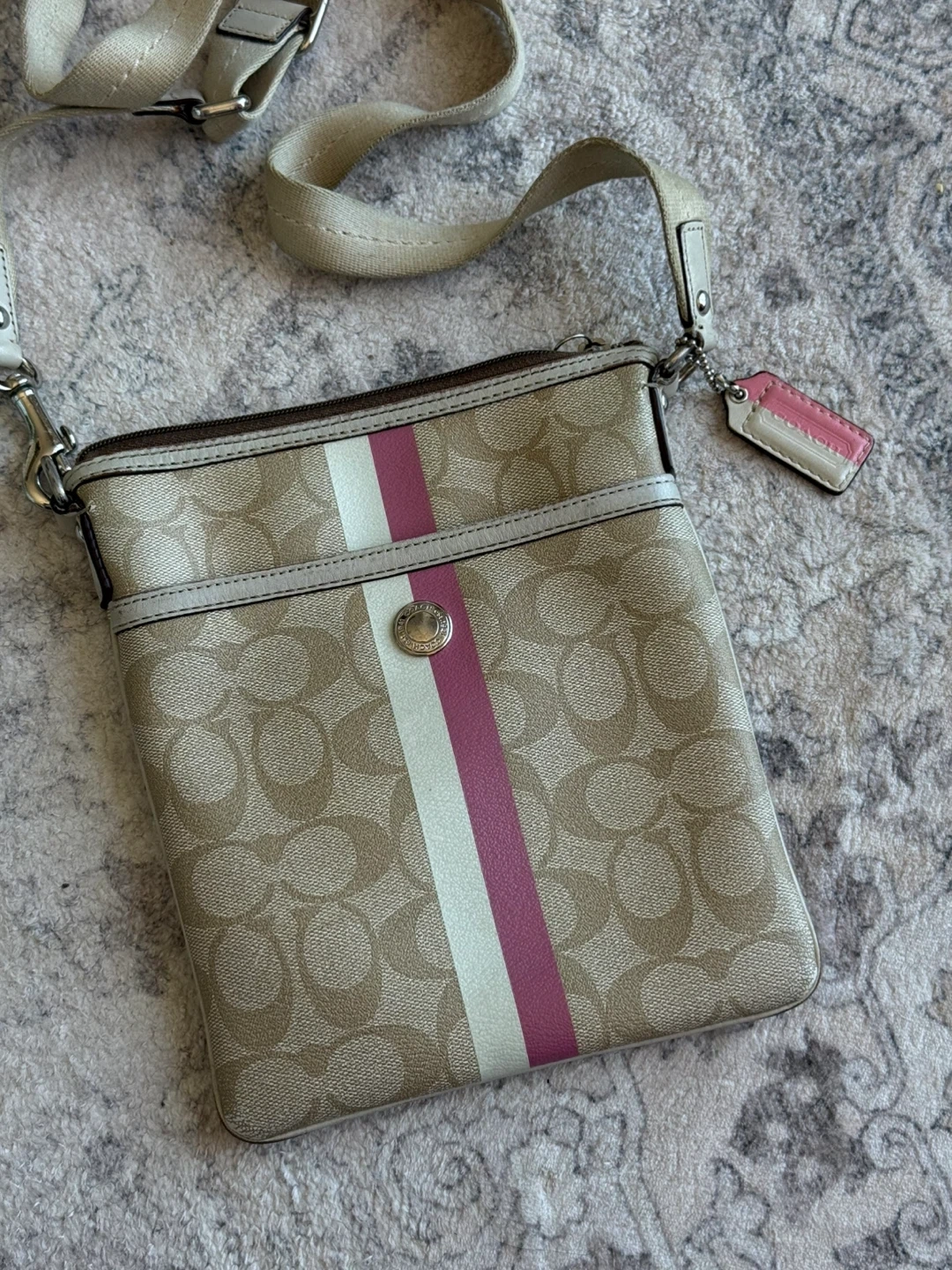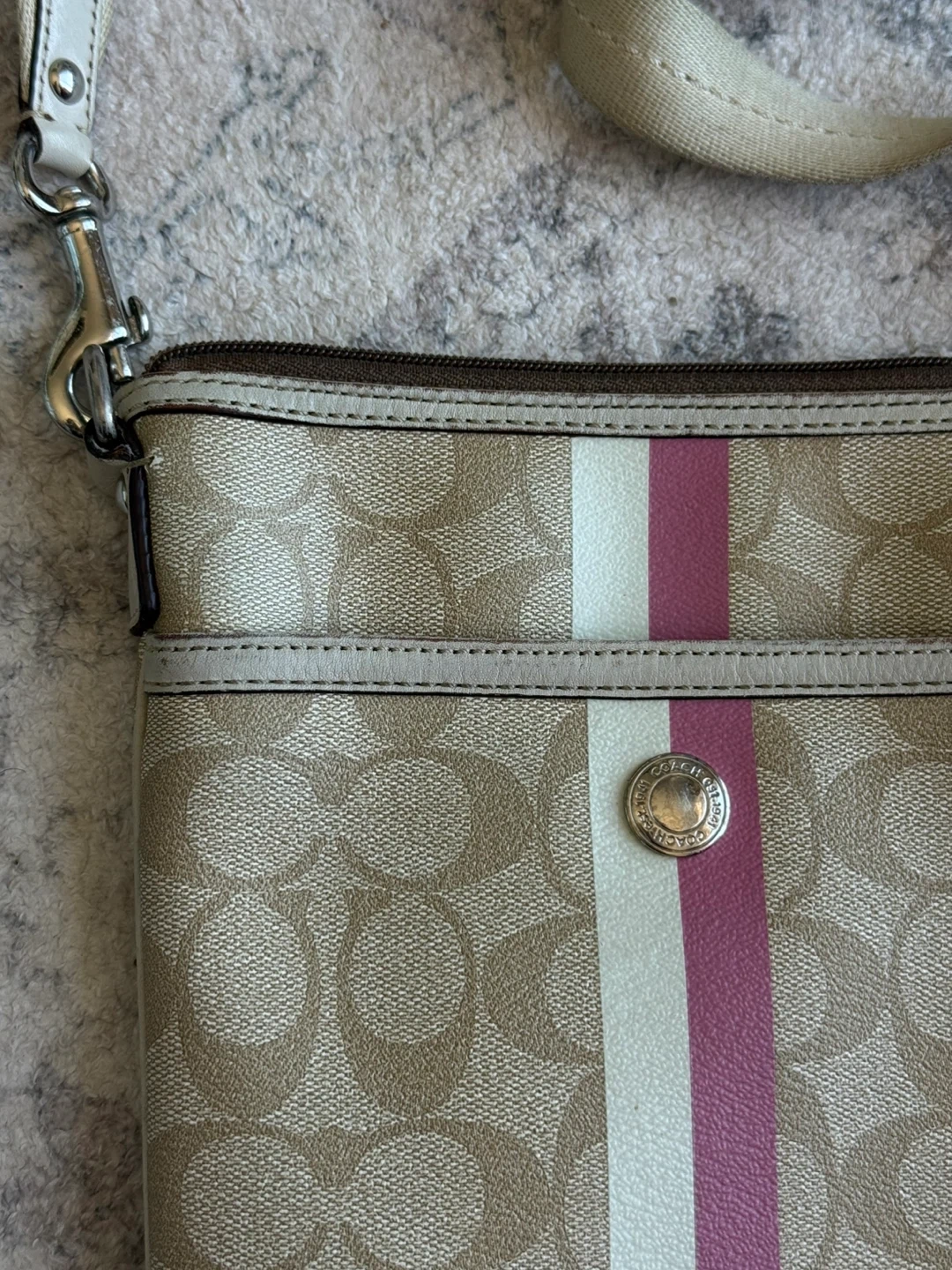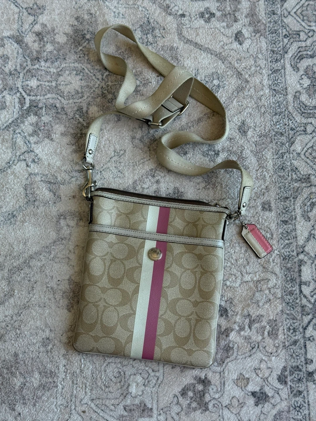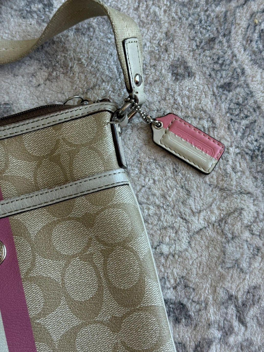 Tan Coach crossbody bag with signature C pattern and pink and white stripe detail. Includes a leather COACH hangtag. Adjustable strap for comfortable wear.