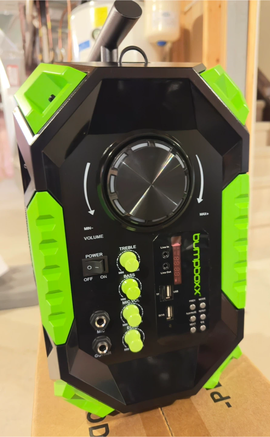 This is a Bumpboxx Flare 8 boombox, featuring a Monster Energy design. It has volume, treble, and bass controls, plus mic and guitar inputs. It also includes USB ports for charging and playback.