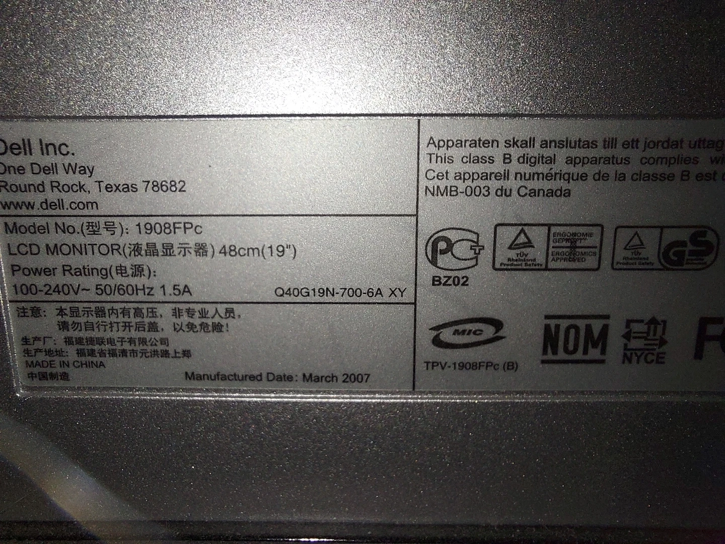 This is a Dell 1908FPc LCD monitor (19-inch). Has VGA and DVI inputs, and two USB inputs on the side of the monitor. Also has an aux sound bar attached as well.