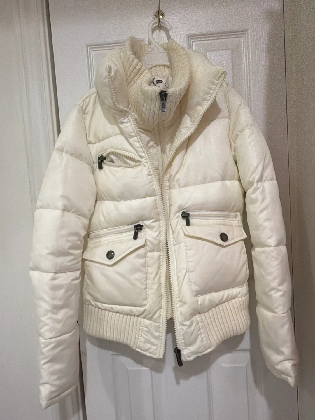 Creamy white puffer jacket from BSK. Features a cozy ribbed knit collar and cuffs for extra warmth. Two zippered chest pockets and two button-flap lower pockets provide storage.