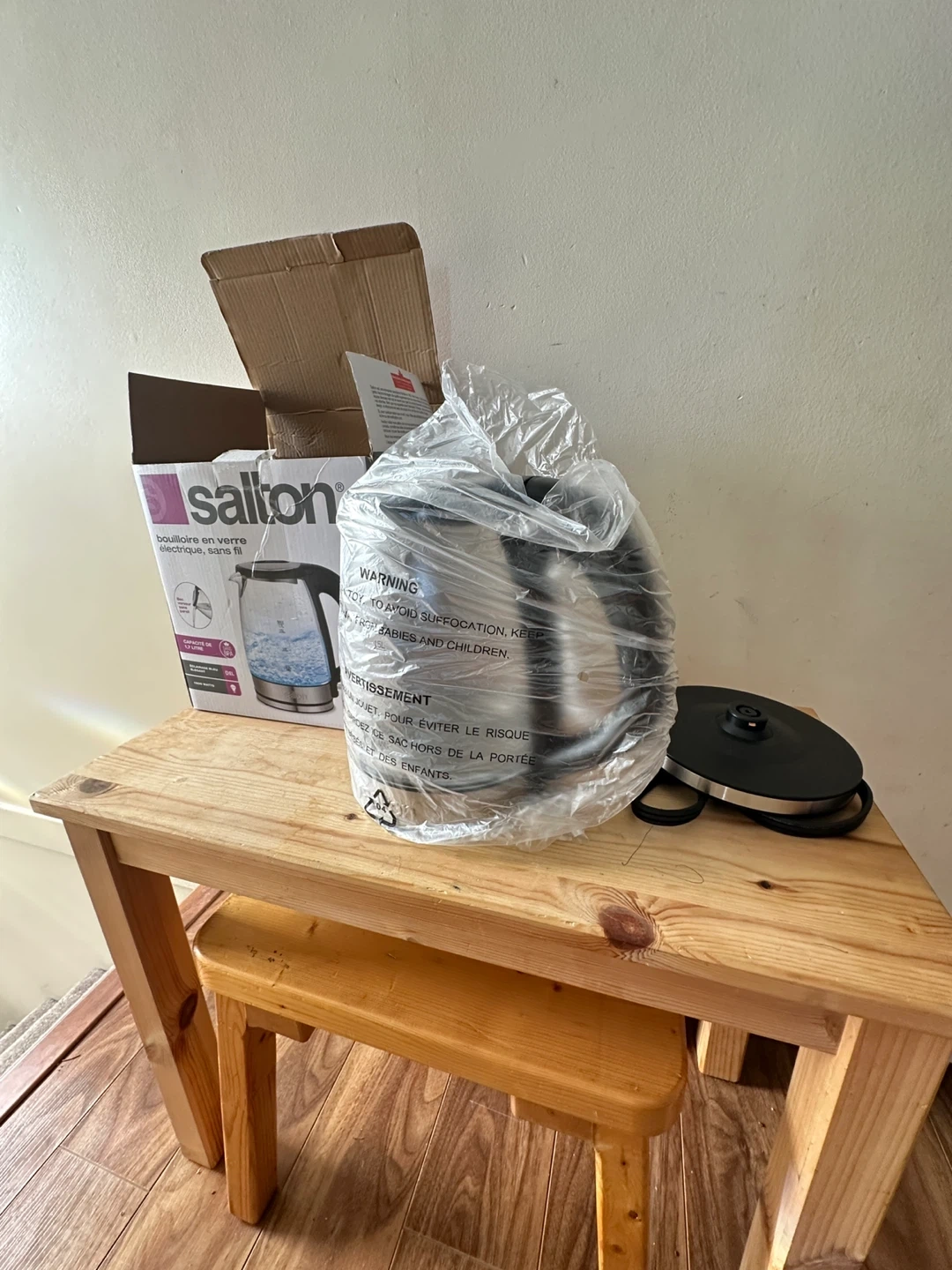 This Salton electric kettle features a glass body and holds up to 1.7 litres. It's cordless and has a 1500 watt heating element. Original box included. The price is nonnegotiable.