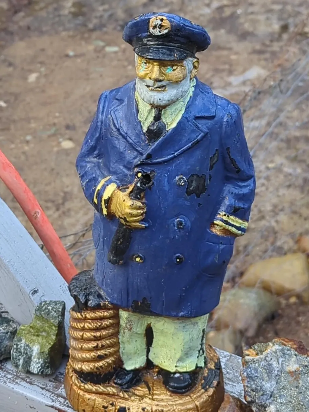 This is a vintage figurine of a captain wearing a blue coat with gold accents. It appears to be made of resin or a similar material. The paint shows some wear, adding to its character. It's a unique piece for nautical decor!