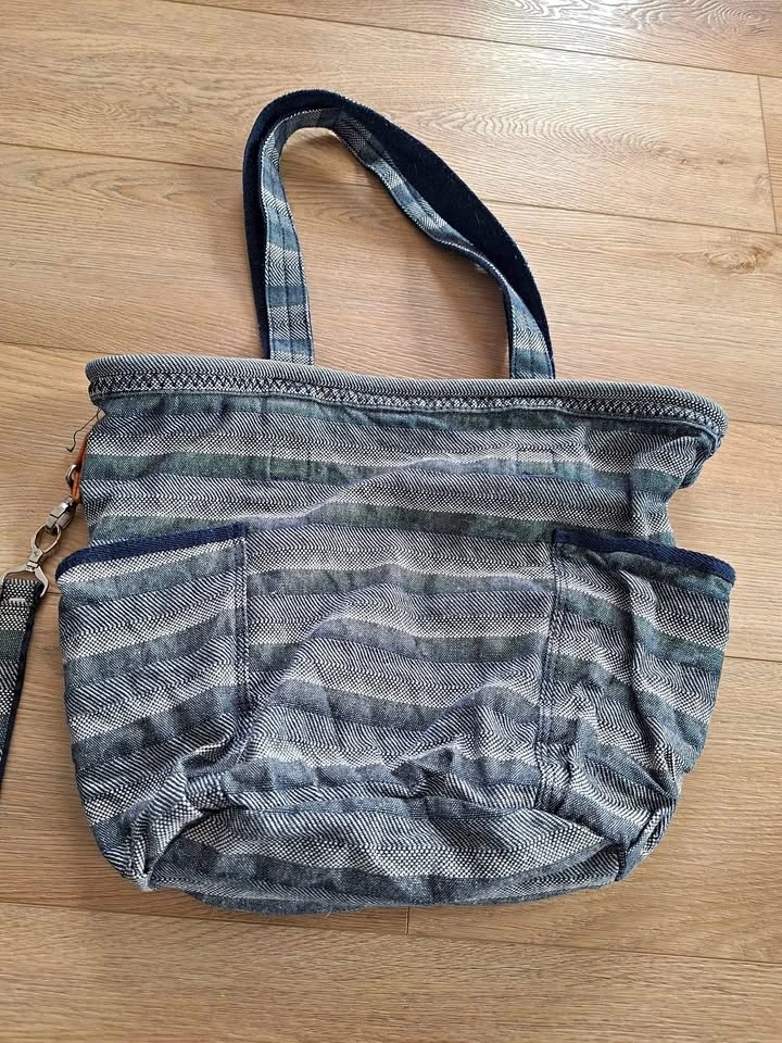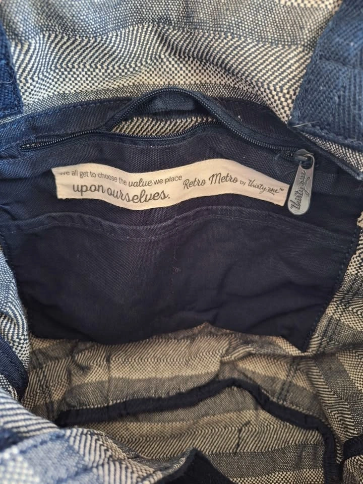 Thirty-one blue striped Retro Metro Bag. Features 2 side pockets, 1 zip pocket, and 2 open pockets inside. Includes key lanyard and side hook.