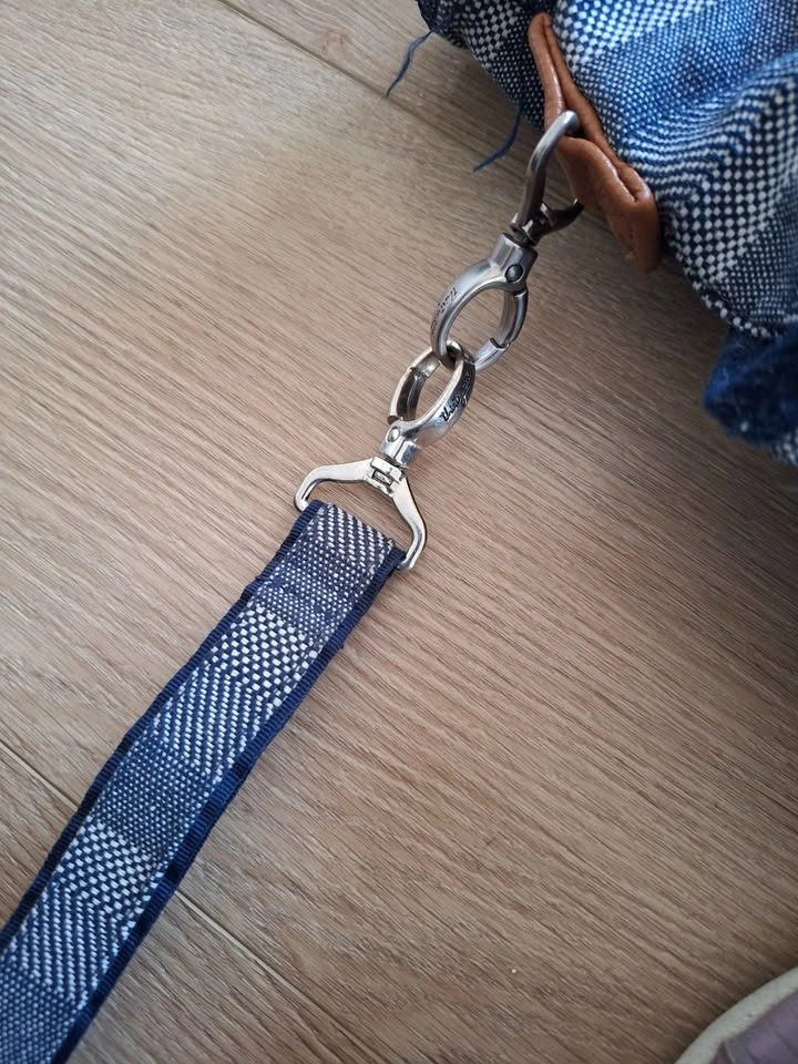 Thirty-one blue striped Retro Metro Bag. Features 2 side pockets, 1 zip pocket, and 2 open pockets inside. Includes key lanyard and side hook.