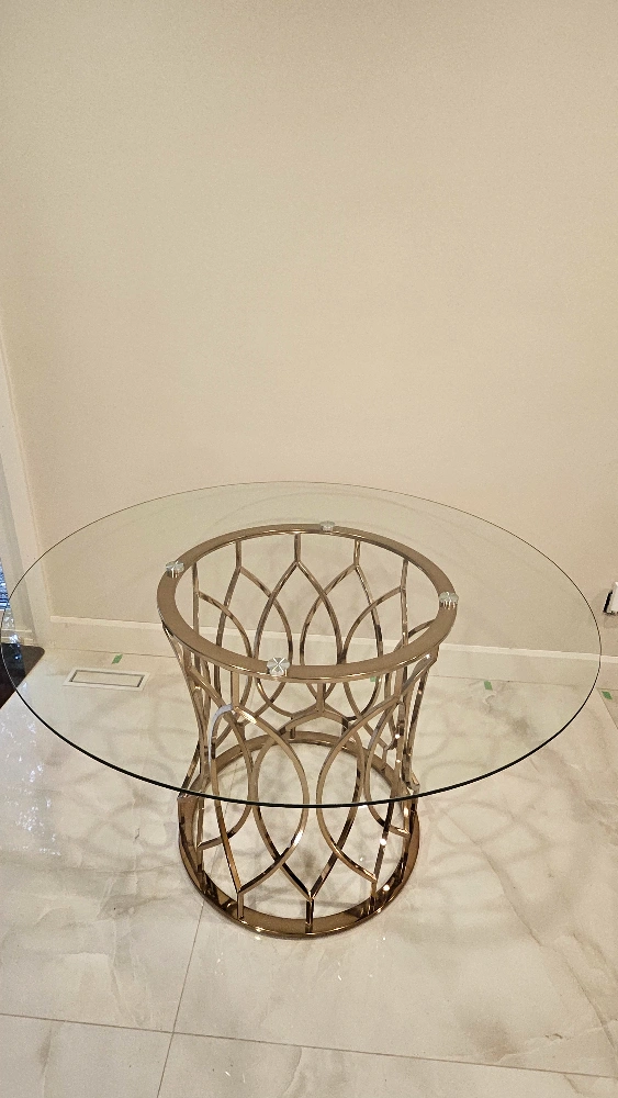 Table: The top is tampered glass, and the leg is metal bronze gold.