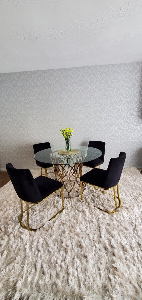 Glass dining table with metal base and four black velvet chairs with gold legs. Chairs have a unique curved design.