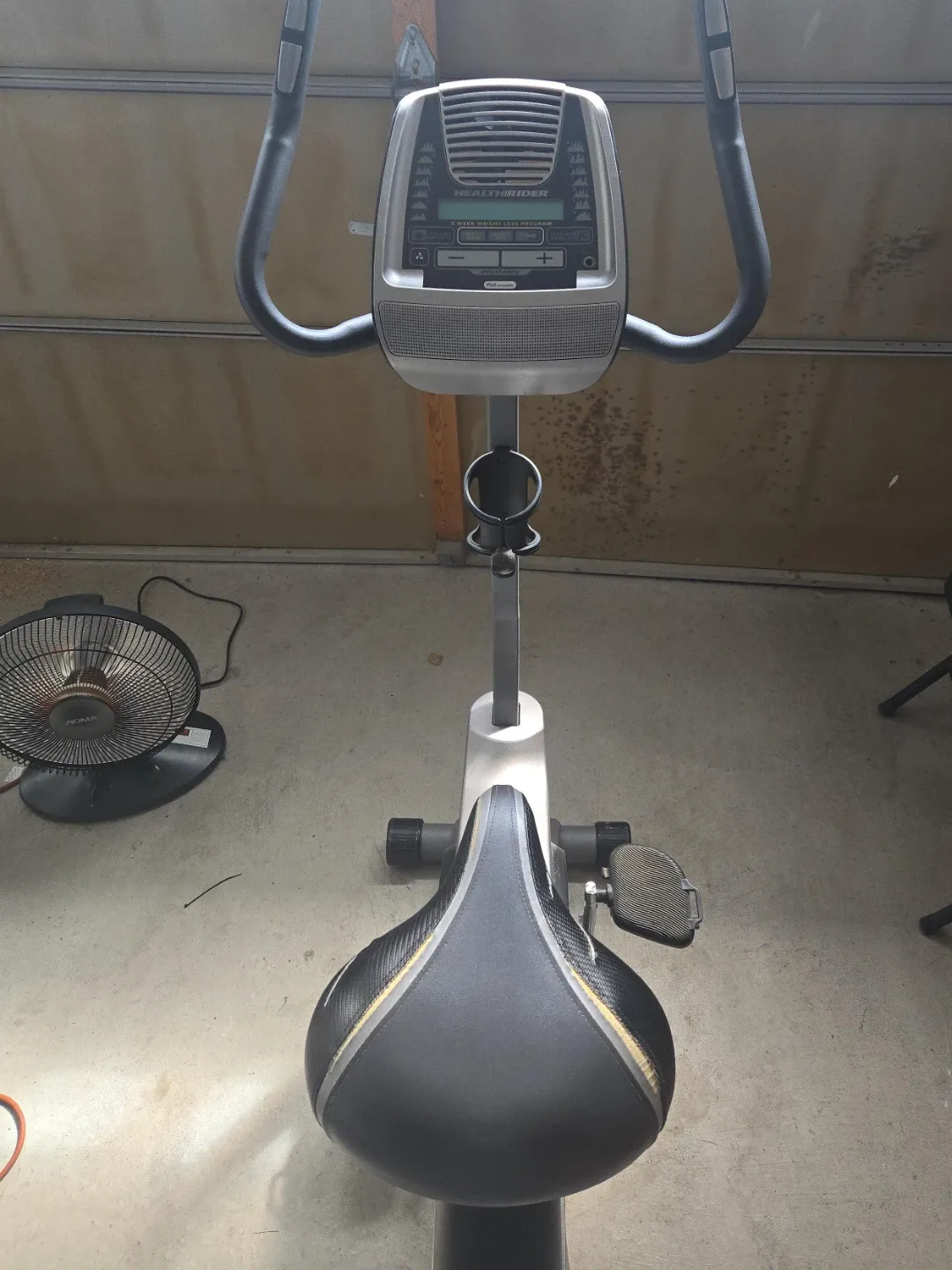 HealthRider exercise bike with adjustable resistance. It has a digital display for tracking your workouts. The seat is padded for comfort.