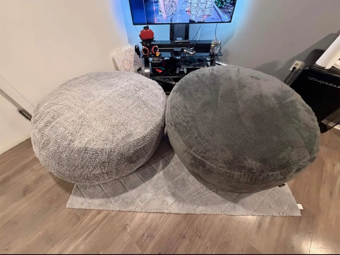 Selling two large, plush pouf ottomans. One is light gray, and the other is dark gray. They're comfortable and versatile for any room. Made with a soft, textured fabric. Perfect for extra seating or as a footrest!