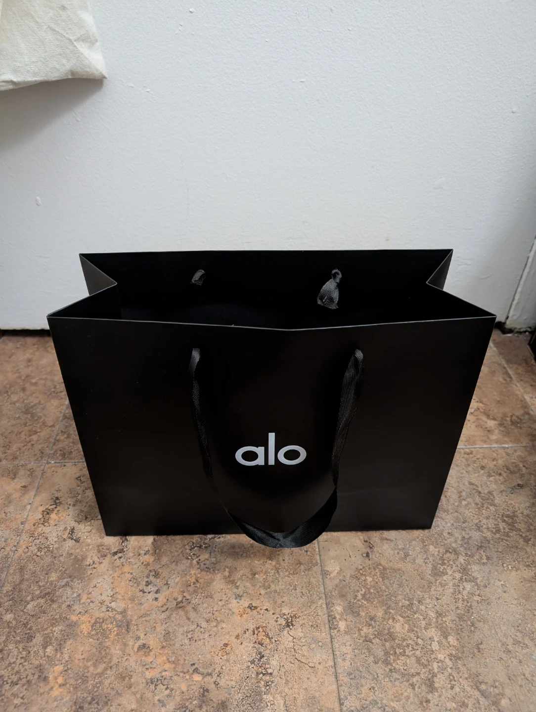 This is an Alo black paper shopping bag. It has ribbon handles and the Alo logo printed on the front. Perfect for carrying purchases!