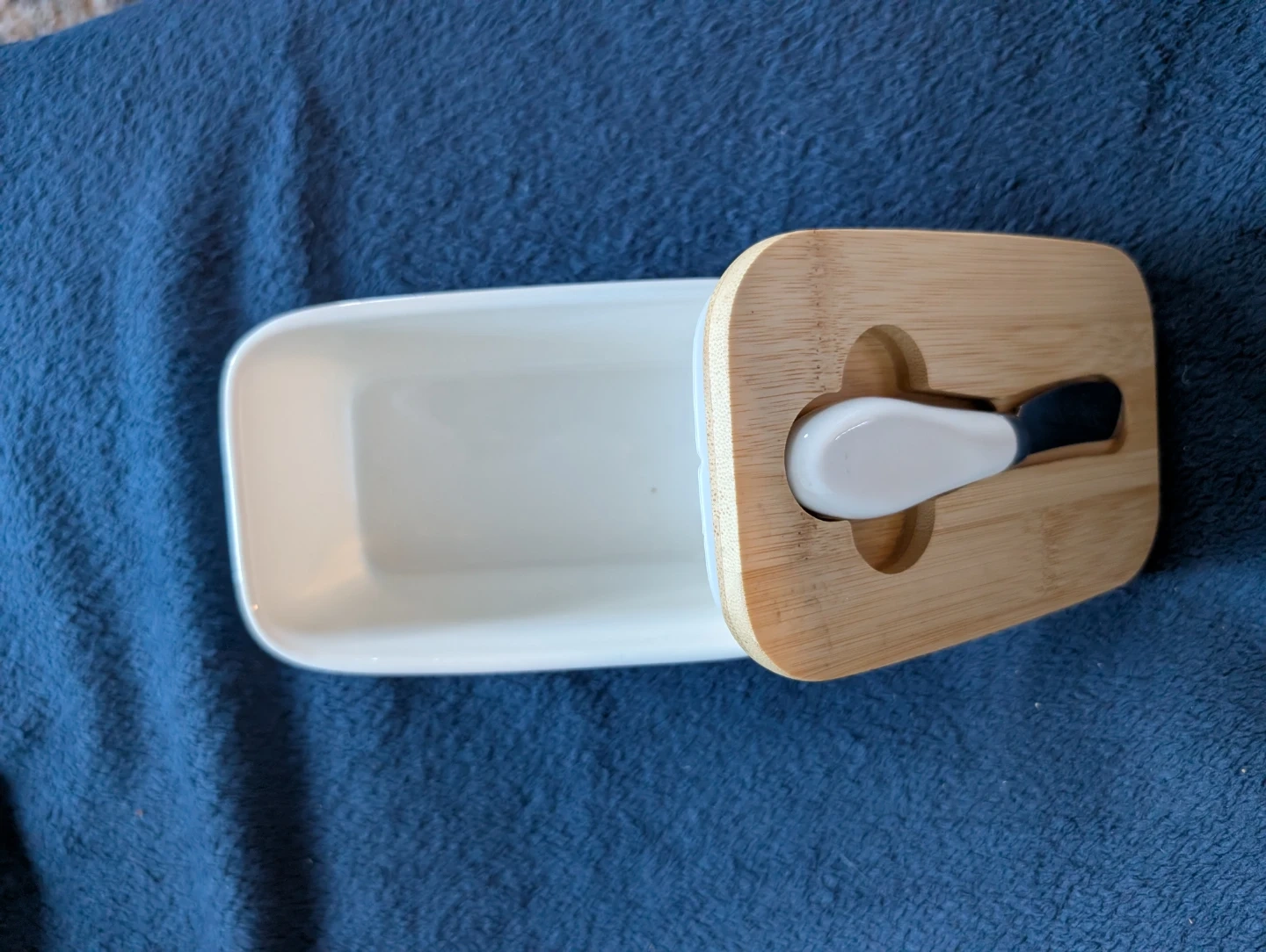 Selling a cute butter dish with a spreader! It's in great condition and ready for a new home. The dish is white with the word 'BUTTER' printed on the side, and it comes with a bamboo lid that has a built-in slot for the included spreader