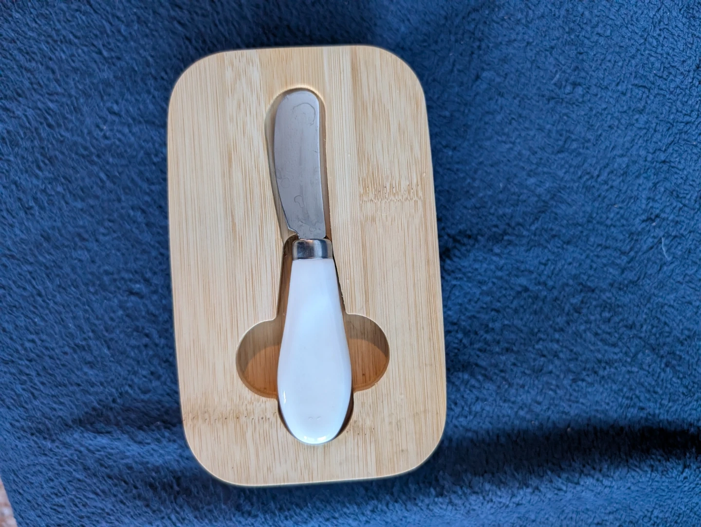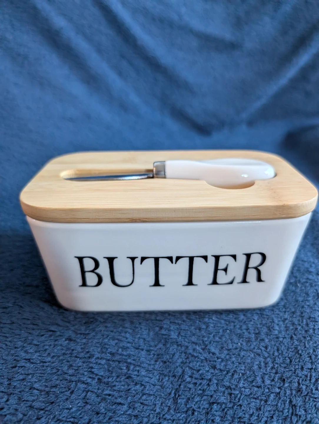 Selling a cute butter dish with a spreader! It's in great condition and ready for a new home. The dish is white with the word 'BUTTER' printed on the side, and it comes with a bamboo lid that has a built-in slot for the included spreader
