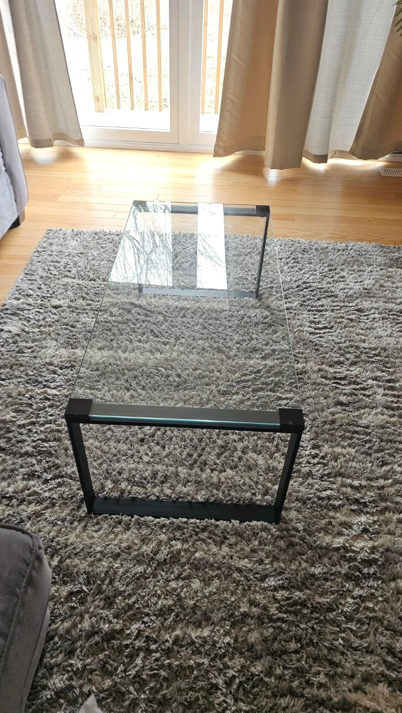 A modern coffee table featuring a clear glass top and a sleek black metal frame. This table's minimalist design fits well in various living spaces. Its simple construction makes it easy to clean.