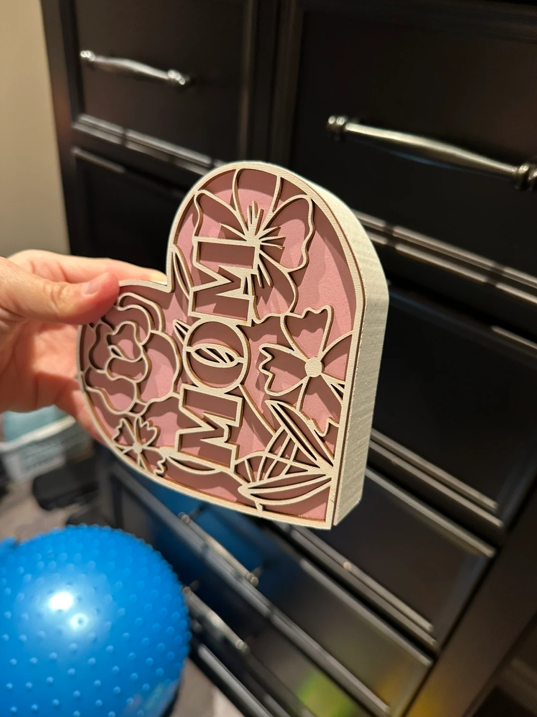 A cute heart-shaped decoration with the word 'MOM' cut out in a floral design. The heart is layered with a pink background and a light wood frame. Perfect for adding a touch of love to any room!