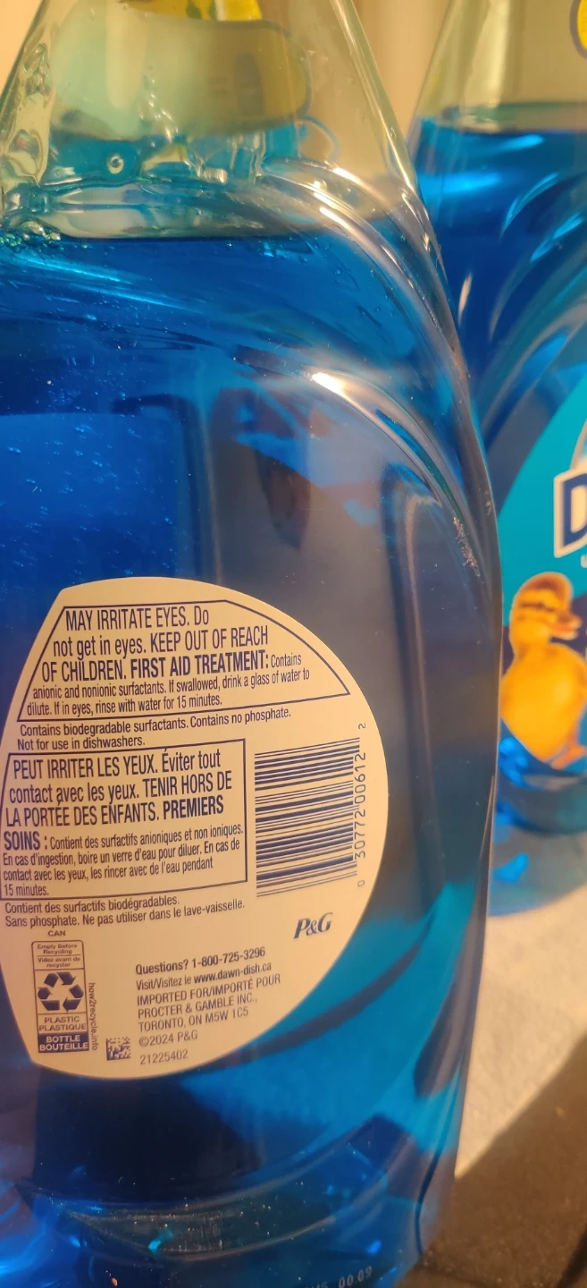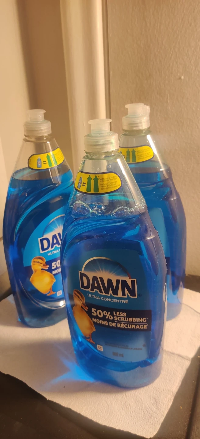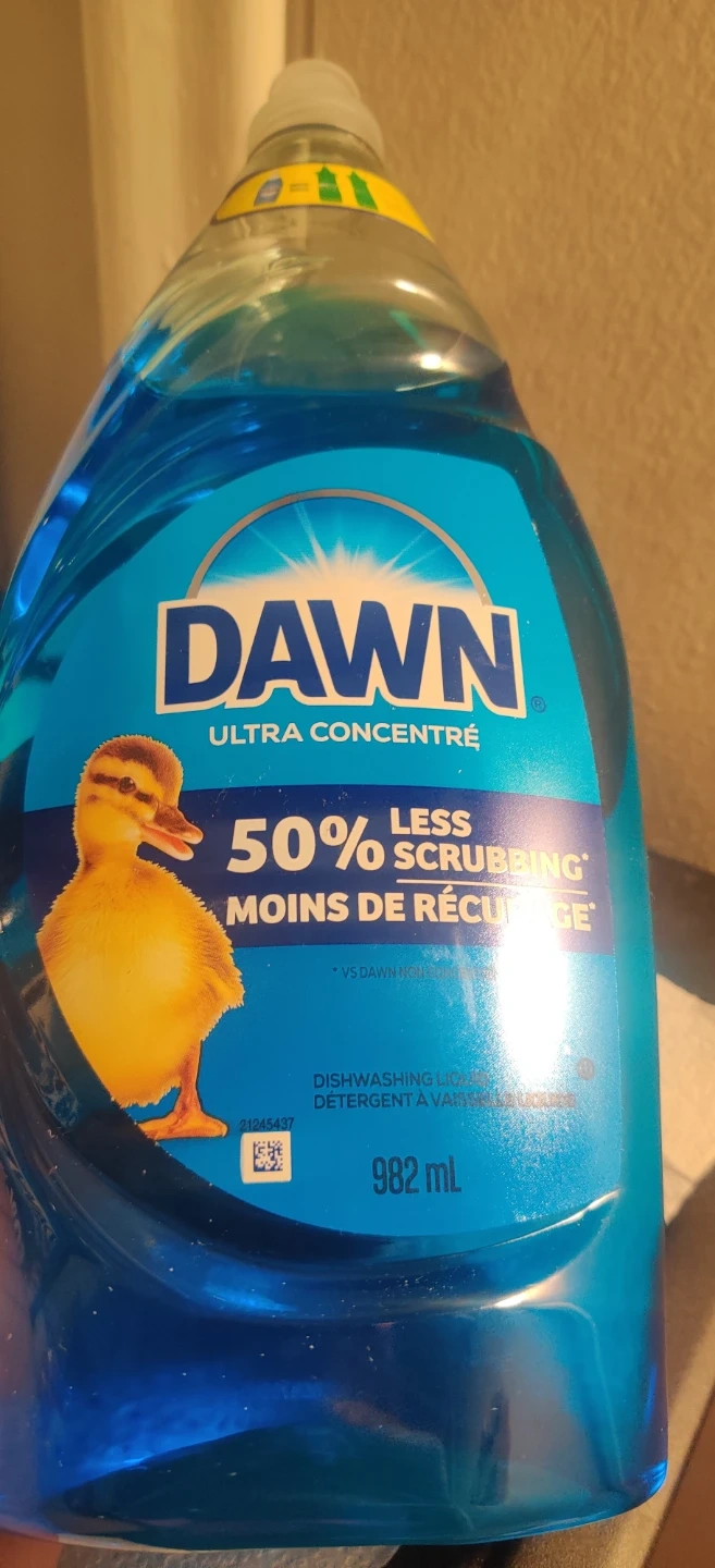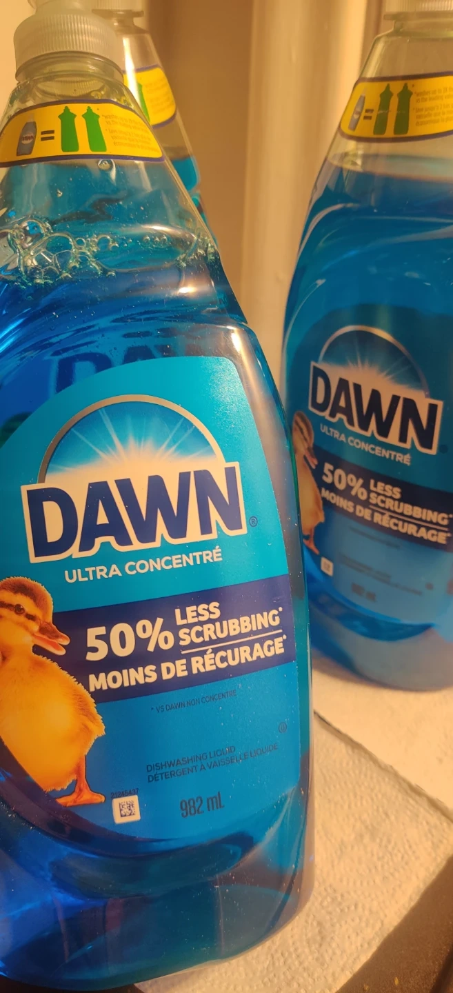 3 Dawn Ultra Concentrated dishwashing liquid. It's 50% less scrubbing than non-concentrated formulas. Each bottle contains 982 ml.