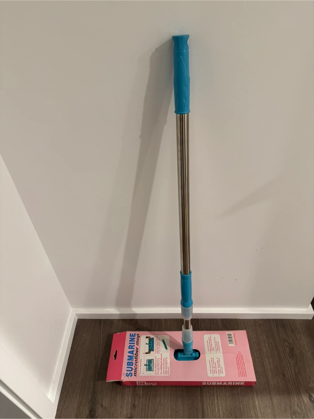 This Submarine microfiber mop comes with a stainless steel handle and blue accents. It's designed for effective floor cleaning. The mop head is made of microfiber material. It's great for everyday cleaning tasks!