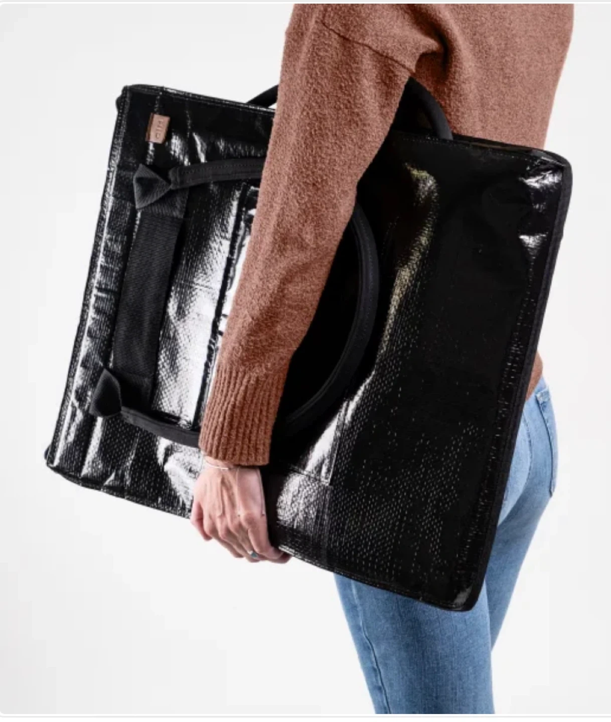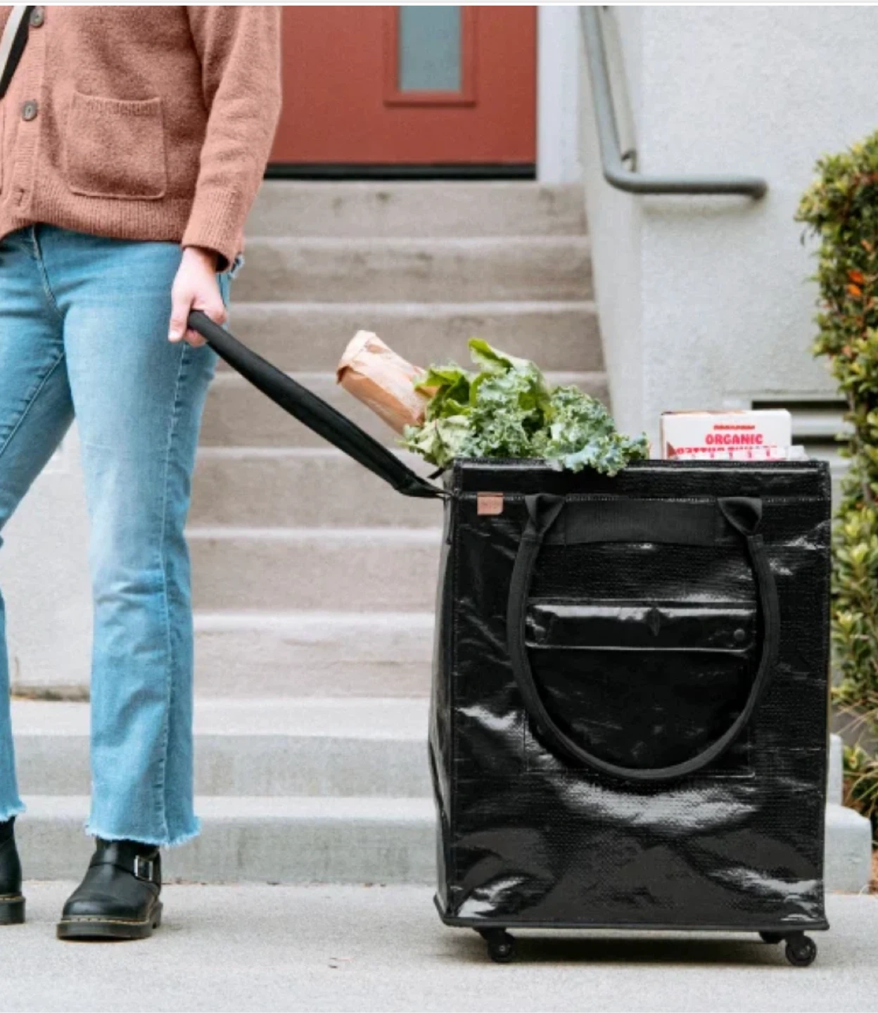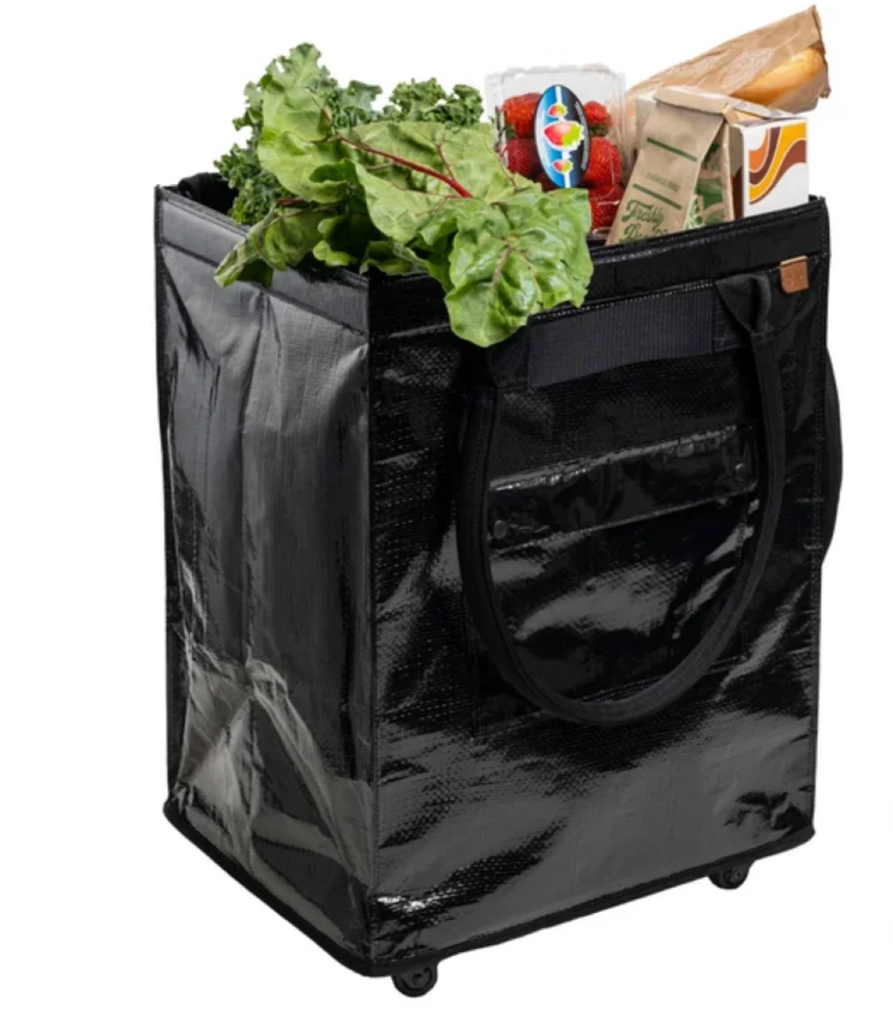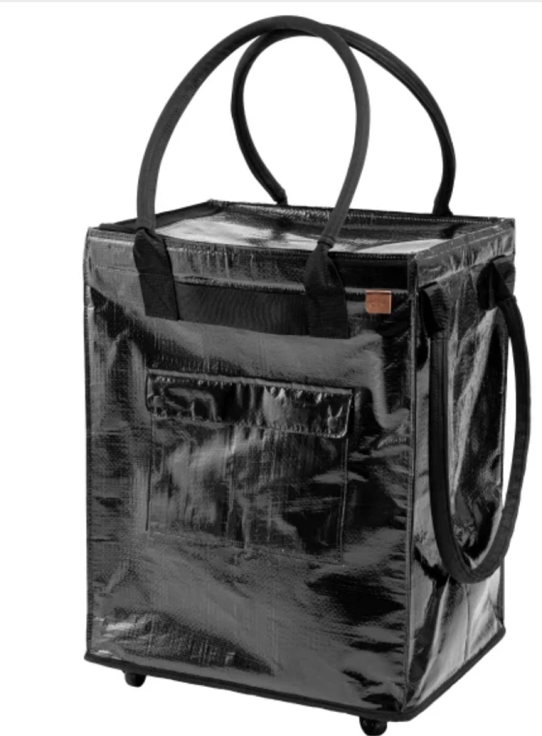 Convenient rolling shopping tote in a glossy black finish. It features sturdy handles and a retractable pull handle for easy transport. Its large capacity makes grocery trips a breeze!
