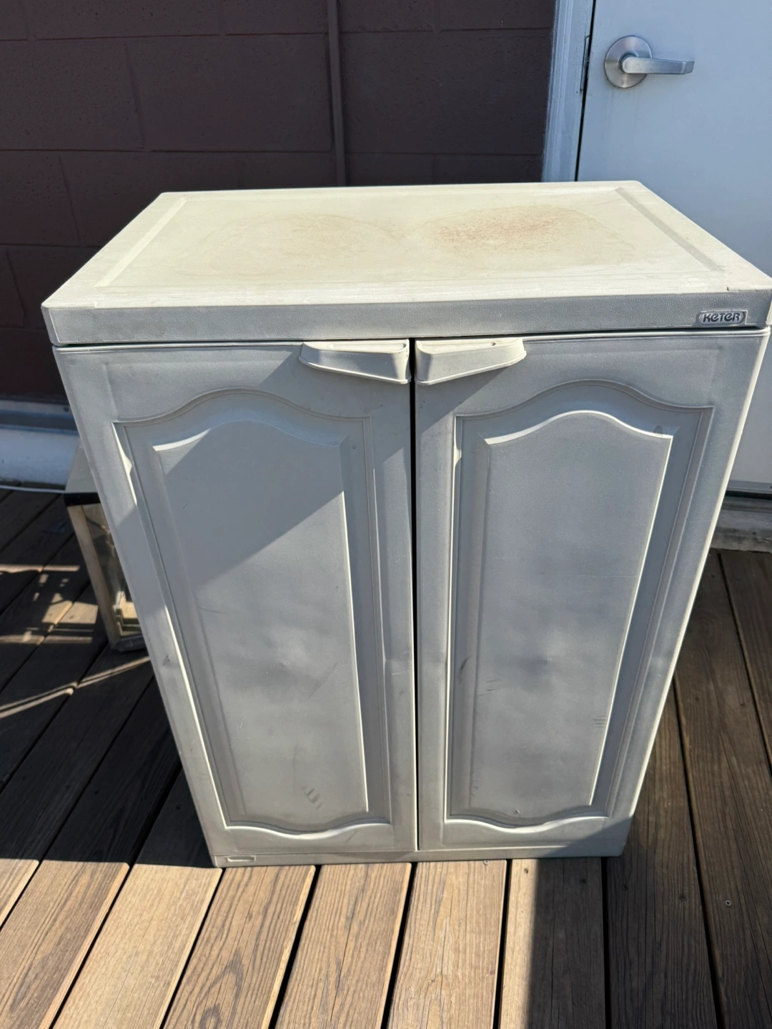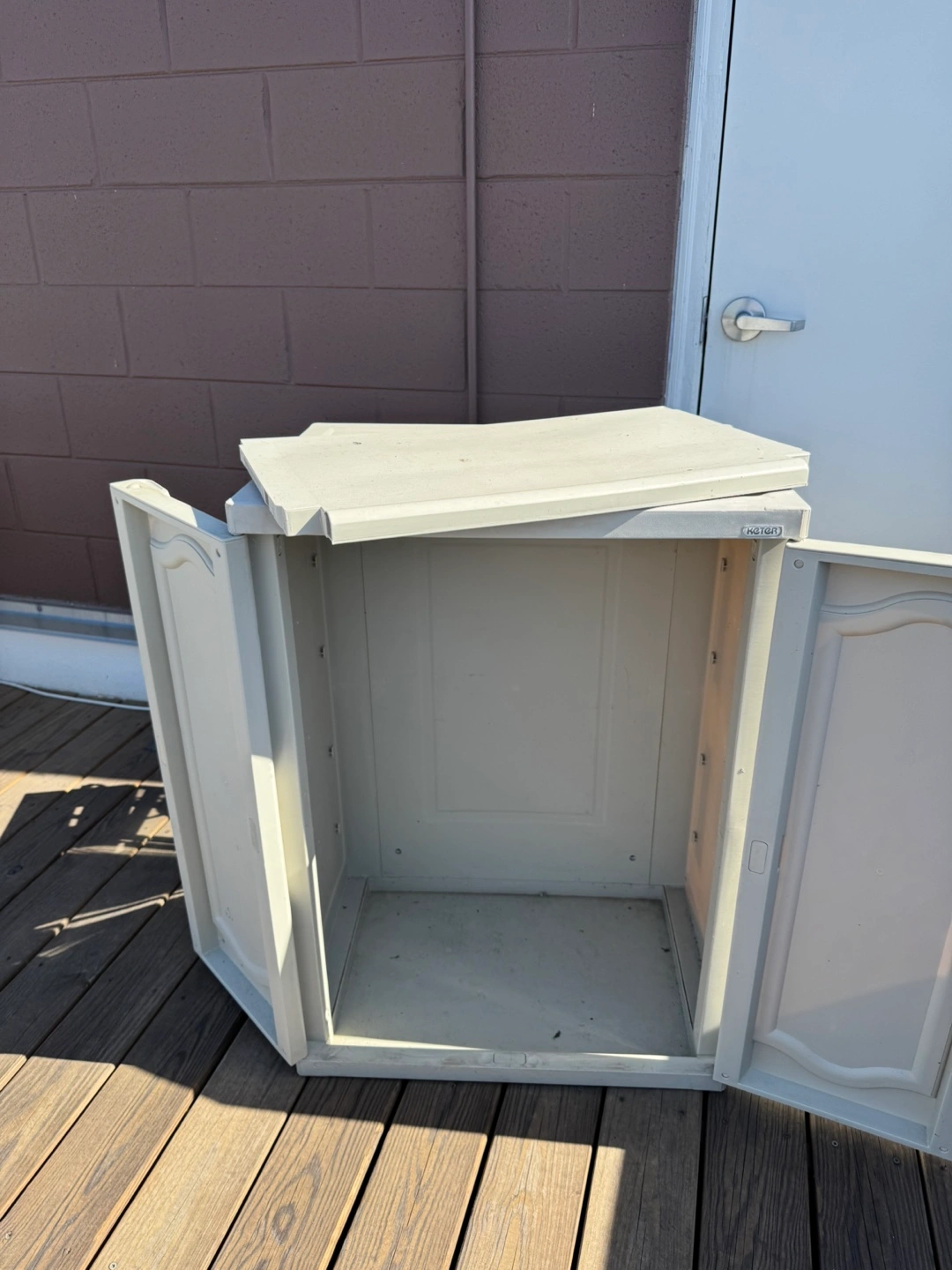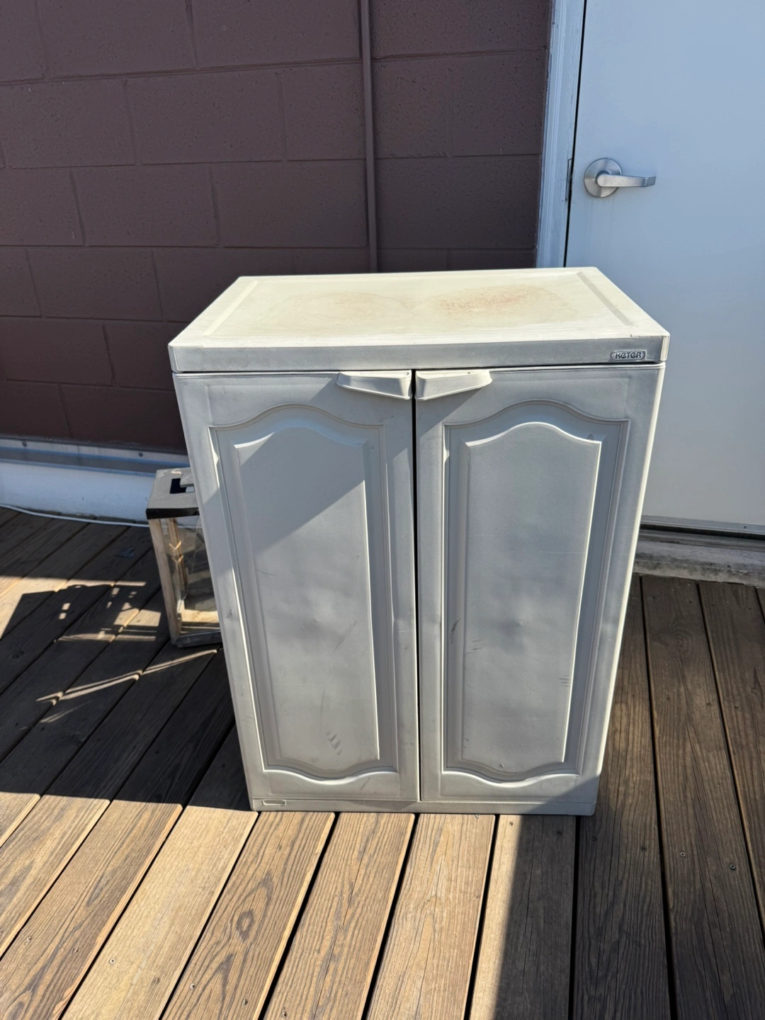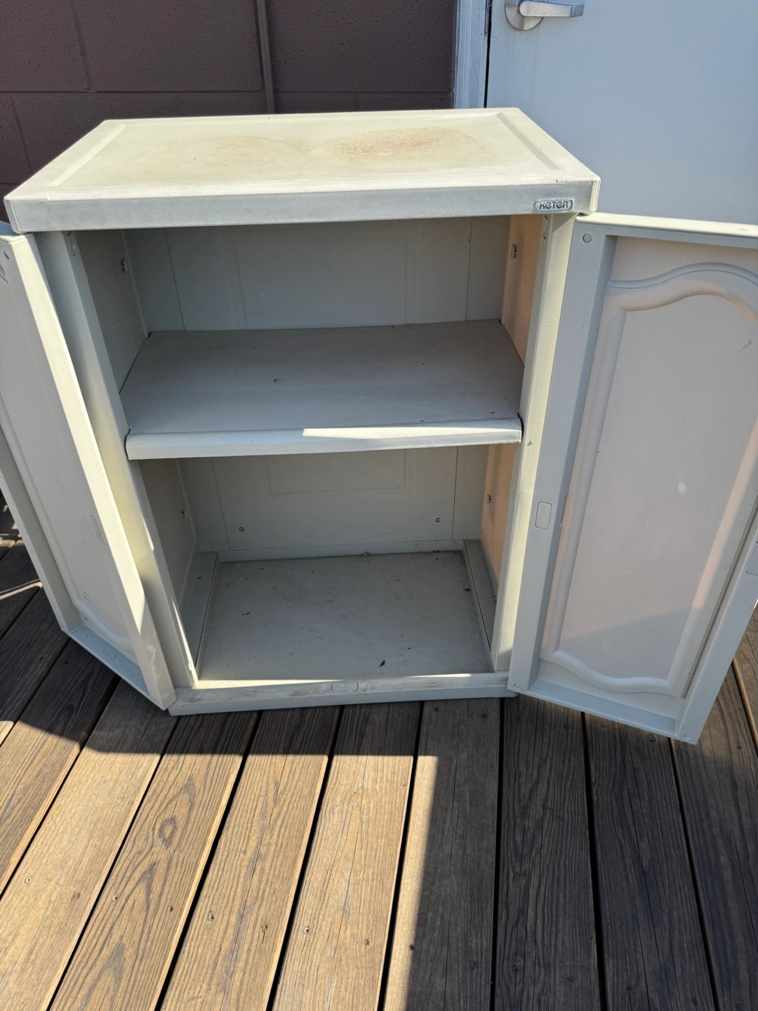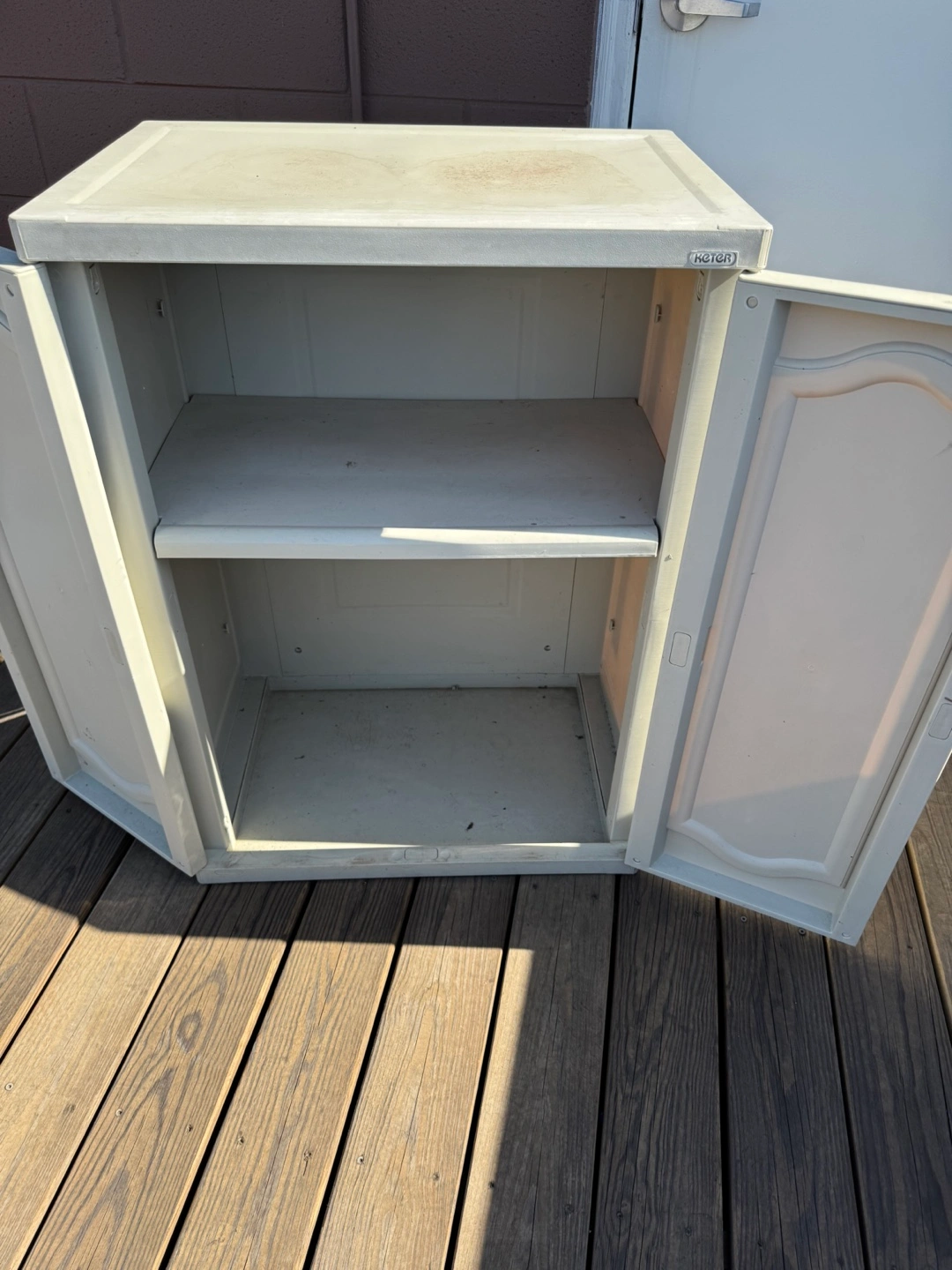 Tan resin outdoor storage cabinet. Two doors, one adjustable shelf.