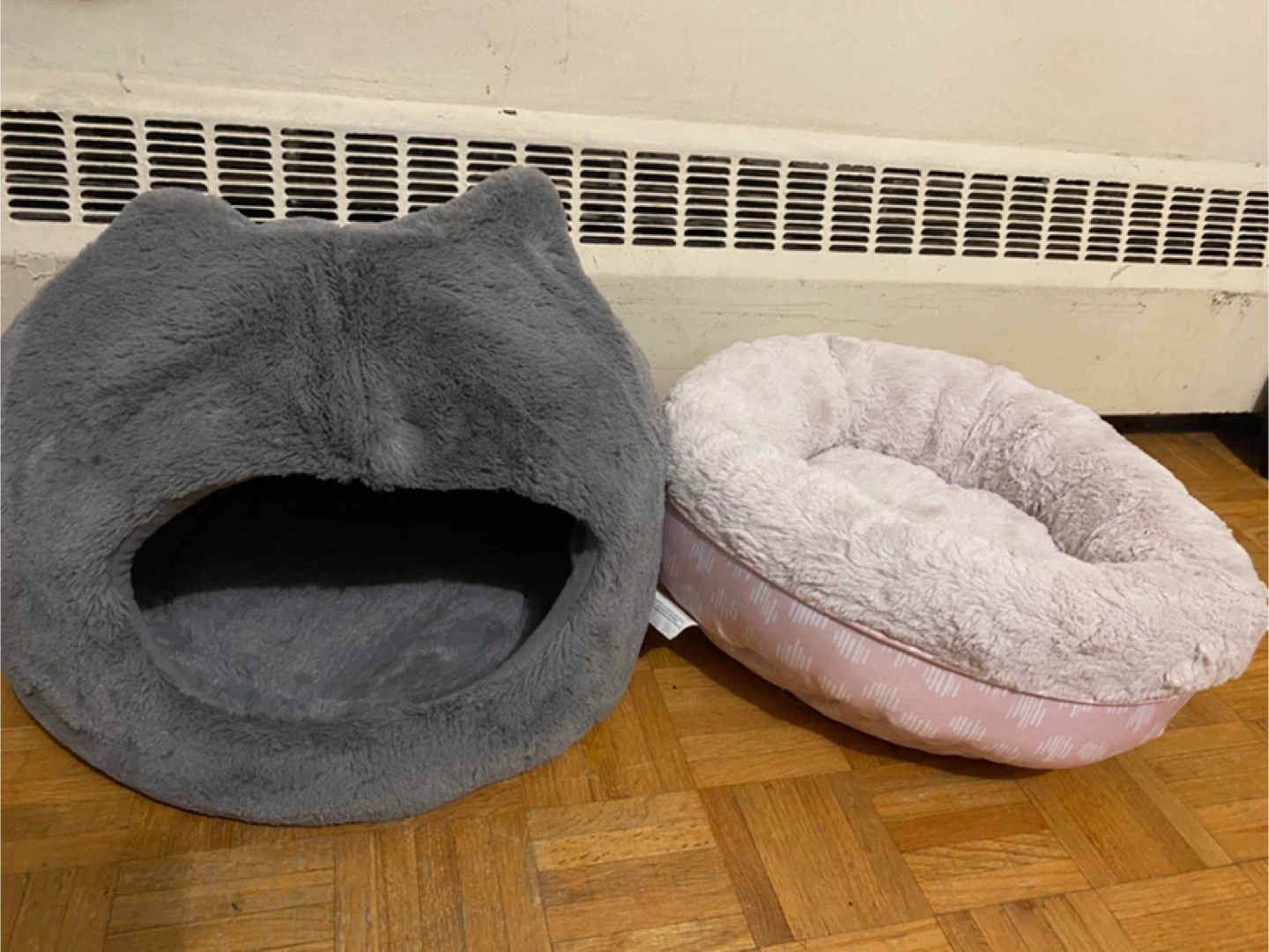 Selling a cozy cat bed bundle! Includes a grey cave-style bed and a soft pink round bed. Perfect for your furry friend to snuggle up in.