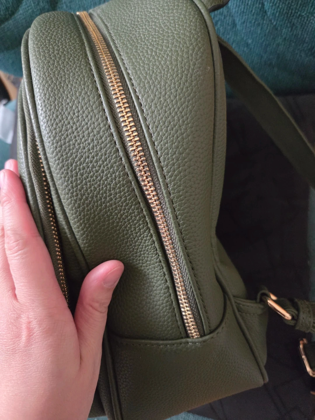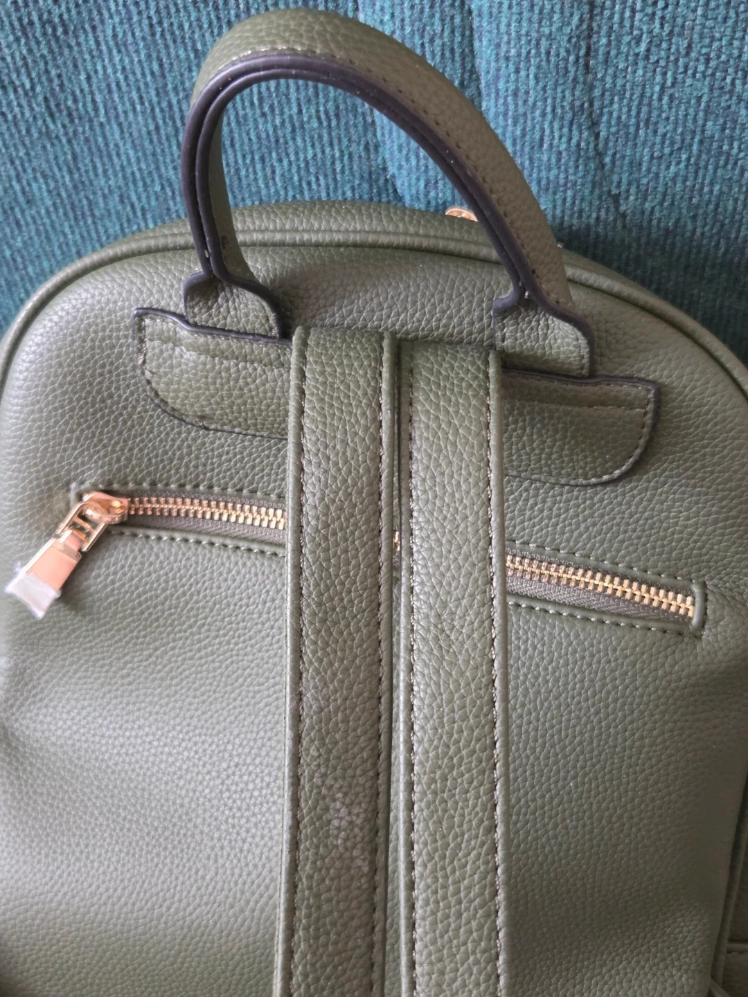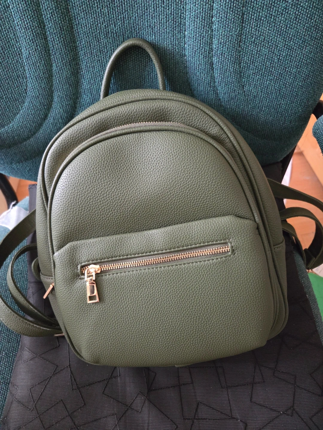 This mini backpack is made of green faux leather and features gold-tone zippers. It has a main zippered compartment with interior pockets and a front zippered pocket. It's a stylish and practical accessory for everyday use!