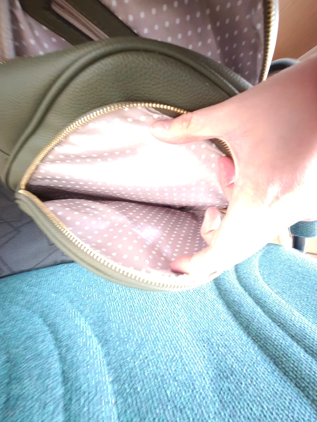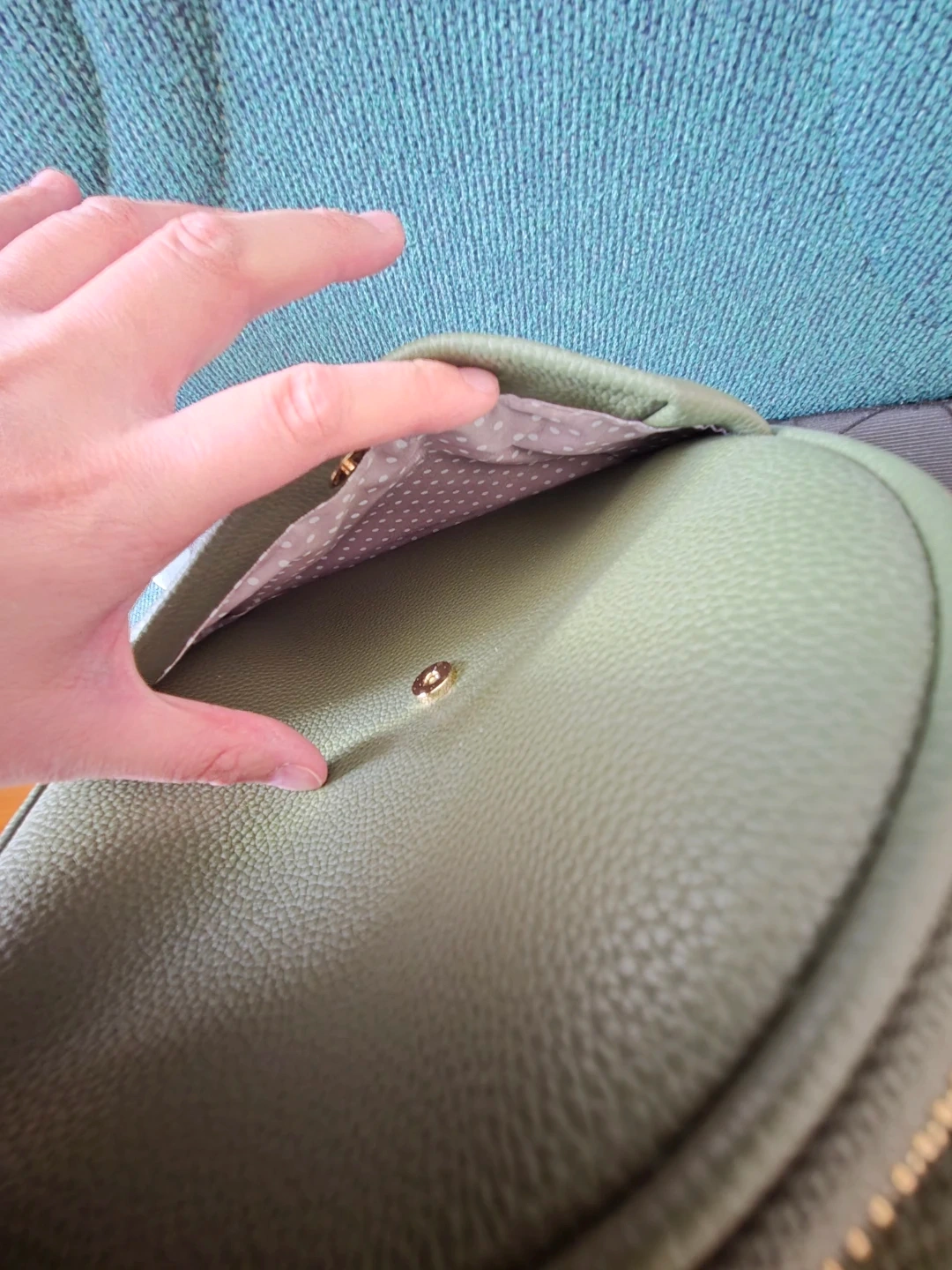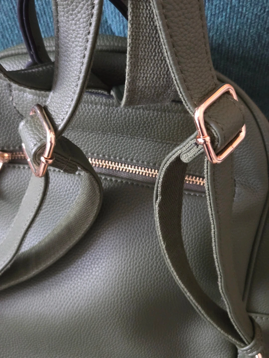 This mini backpack is made of green faux leather and features gold-tone zippers. It has a main zippered compartment with interior pockets and a front zippered pocket. It's a stylish and practical accessory for everyday use!