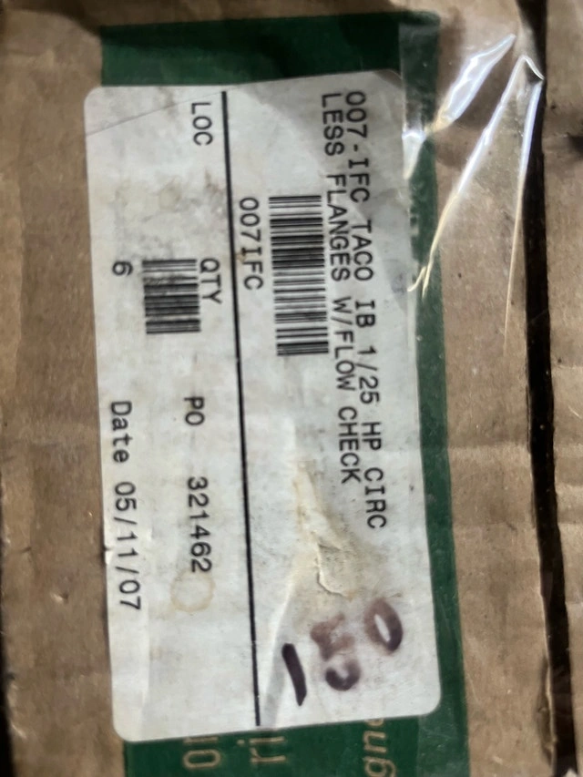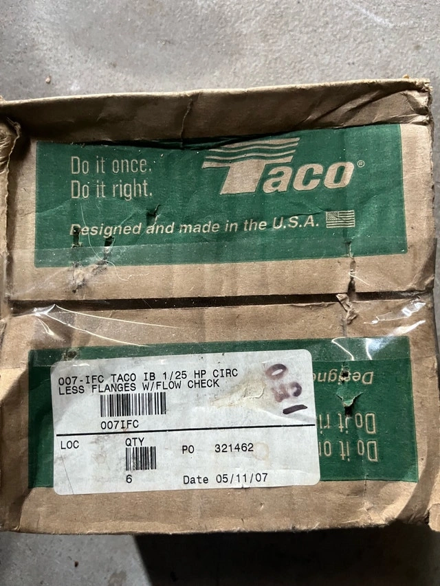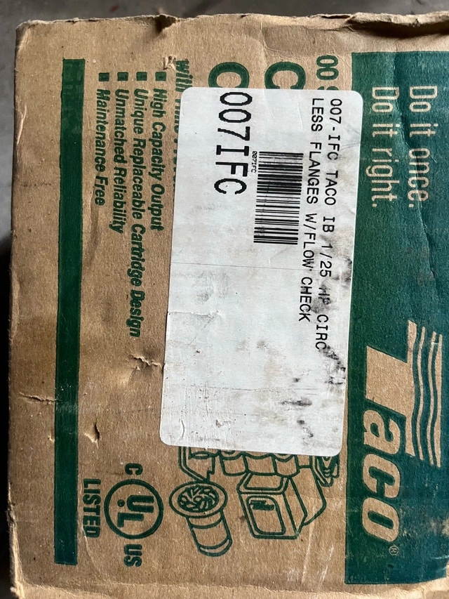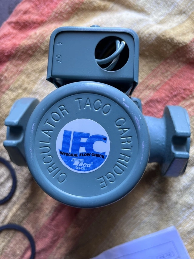 Selling a Taco 007-F5-7IFC Cartridge Circulator for hot water heating systems. Features a 1/25 HP motor and integral flow check. This unit is reliable and maintenance-free. It's in good, unused condition, though the box is a bit rough. Manual included. If the ad is up, it's available.