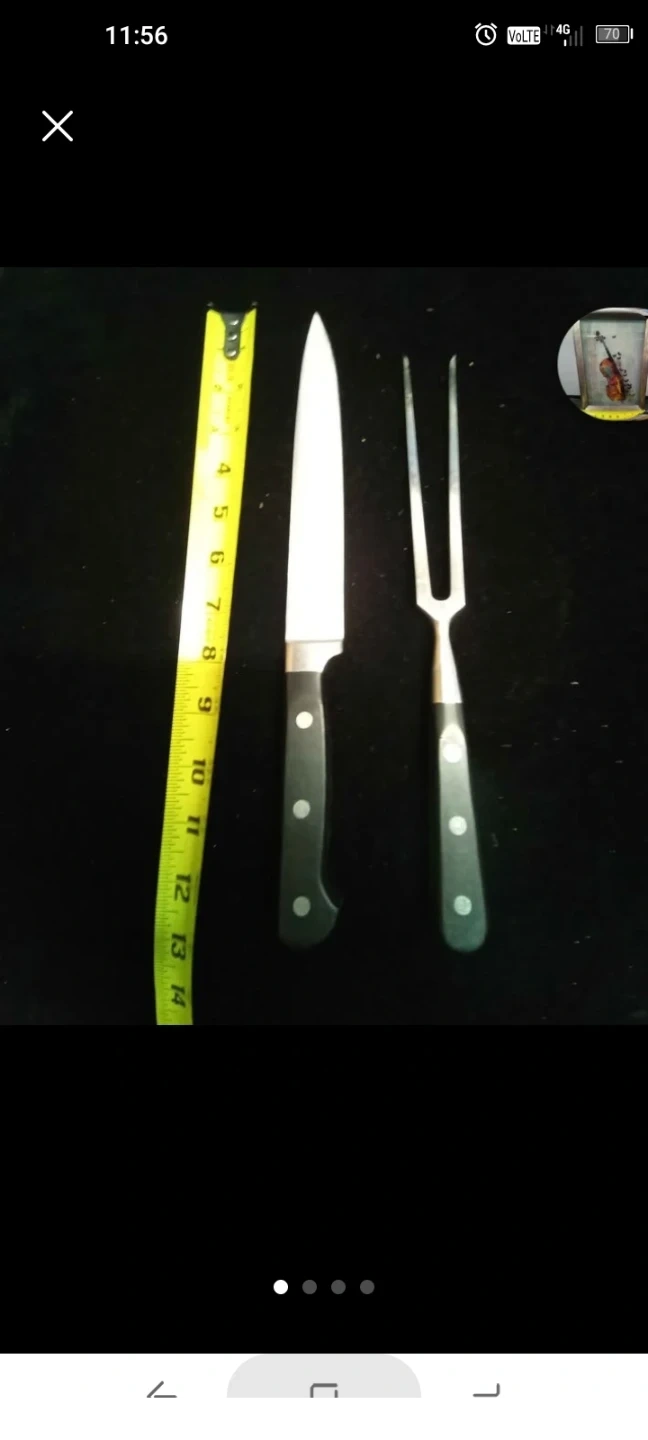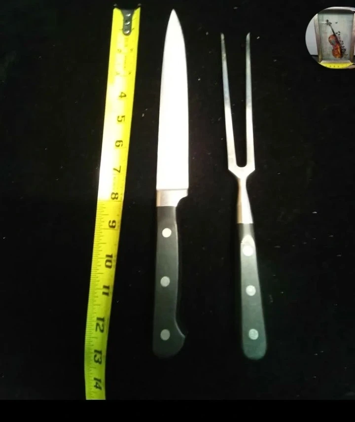Includes a carving knife and a carving fork. Knife blade measures approximately 8 inches. Fork tines measure approximately 4 inches. Both have black handles.