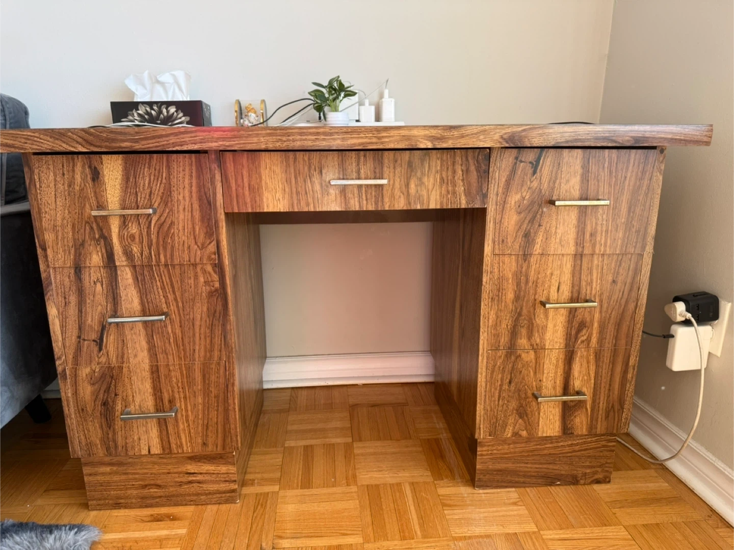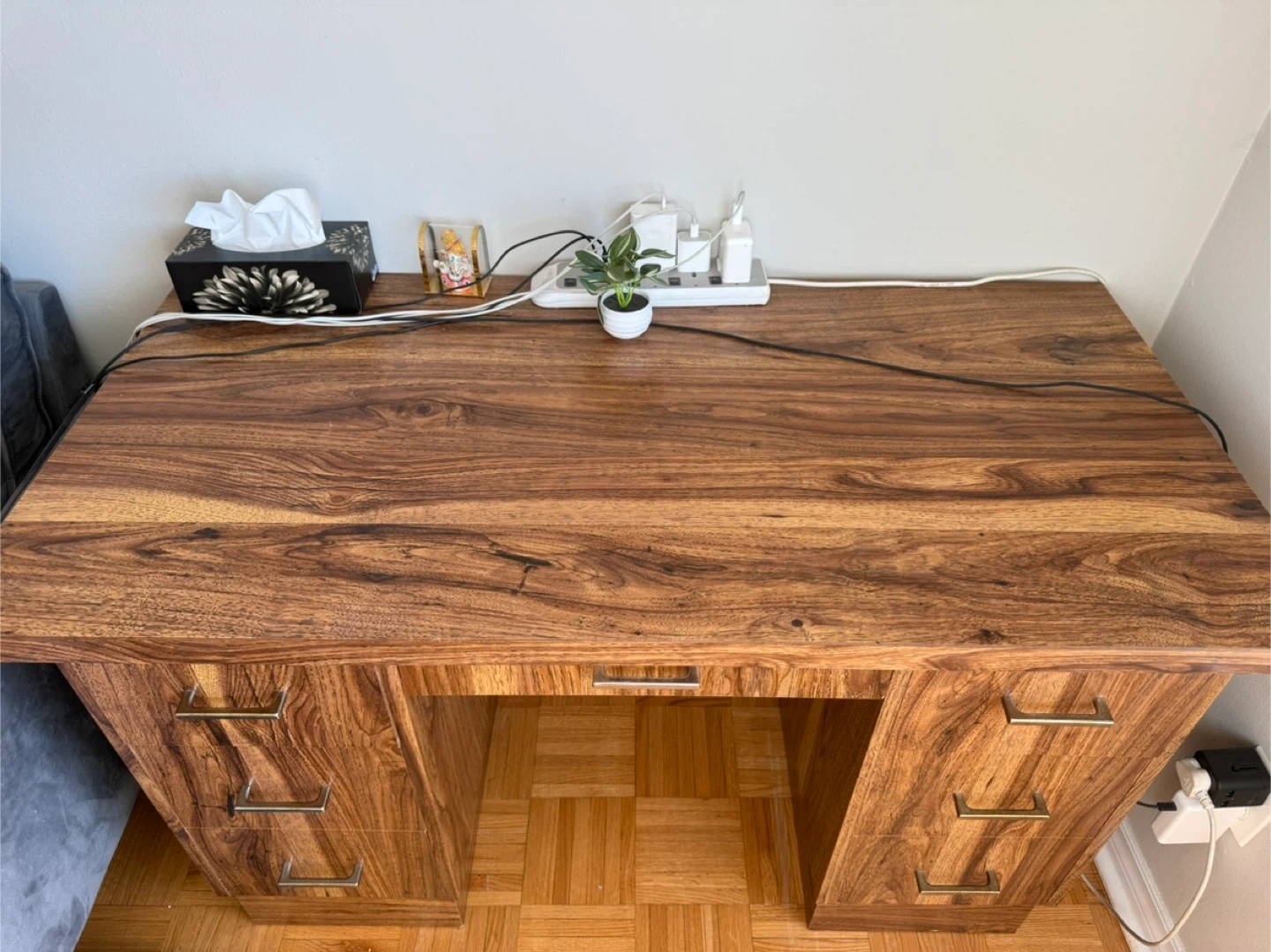 A sturdy wooden desk featuring multiple drawers for storage. Its rich wood grain pattern adds a warm touch to any home office. This desk is perfect for organizing your workspace and keeping essentials close at hand.