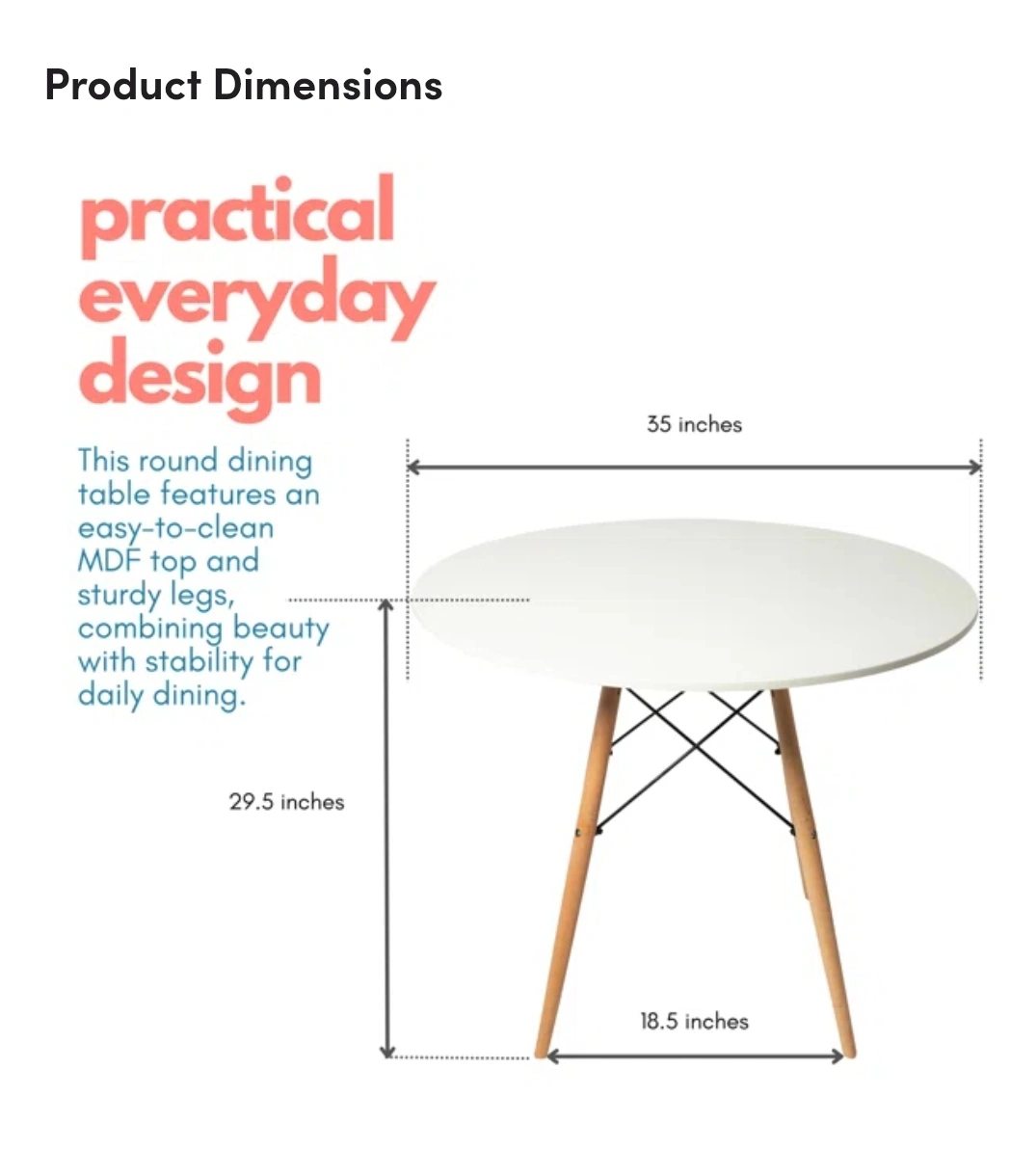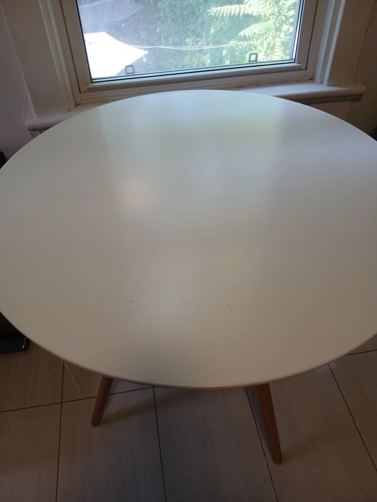 Selling a round dining table with a white MDF top and sturdy legs. Some wear to the white finish as shown in pictures, but only noticable if you look closely. The table is 35 inches in diameter and 29.5 inches tall.