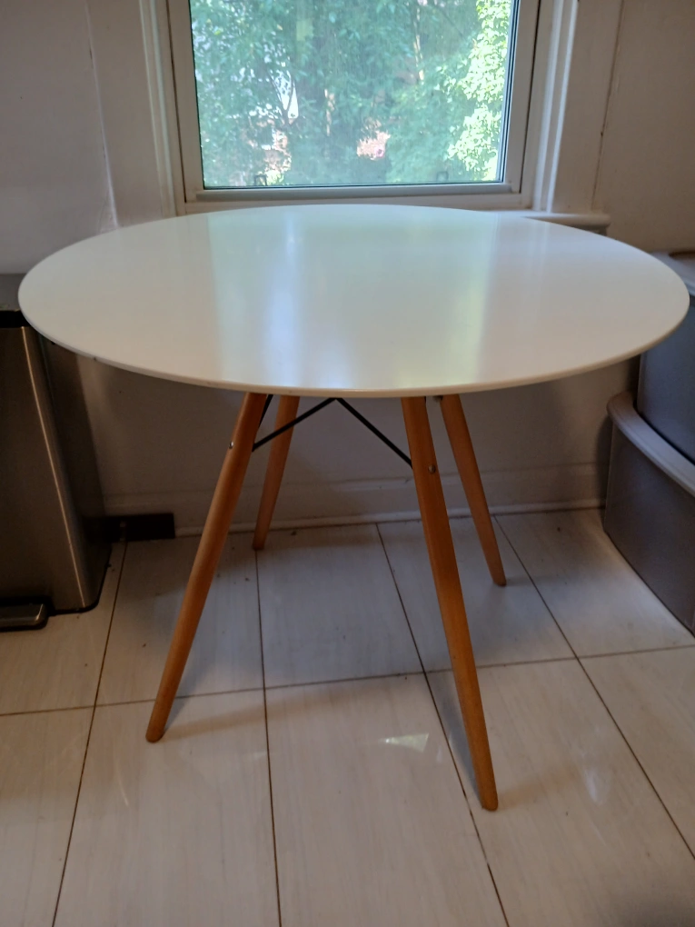Selling a round dining table with a white MDF top and sturdy legs. Some wear to the white finish as shown in pictures, but only noticable if you look closely. The table is 35 inches in diameter and 29.5 inches tall.