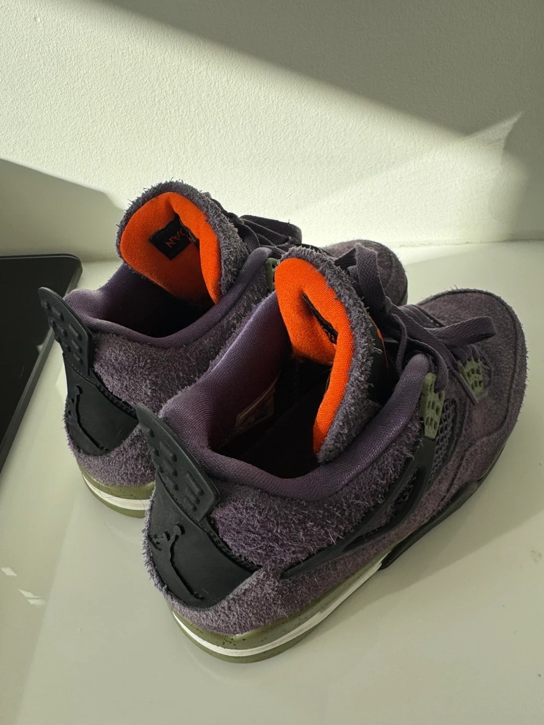 These Nike Air Jordan 4s feature a fuzzy purple suede upper with orange accents and black detailing. The iconic Jumpman logo is visible on the tongue. These sneakers are in a purple colourway and have laces. These shoes are great for everyday wear and casual outings.