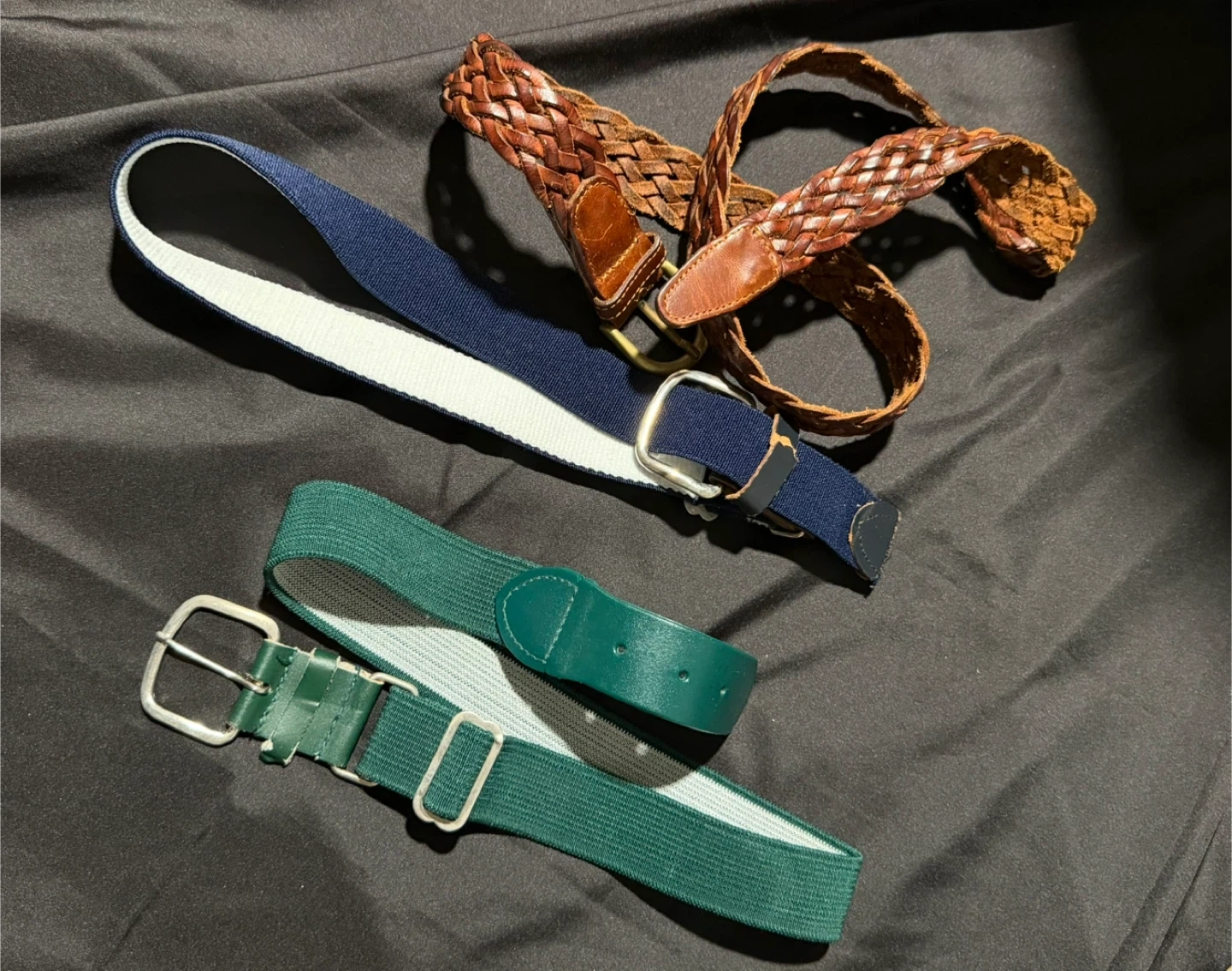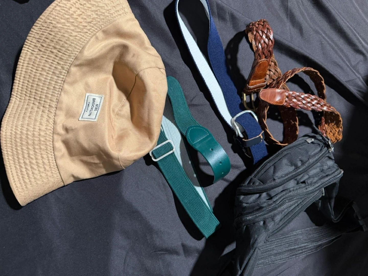 NEW AND USED This bundle includes a tan bucket hat with 'N.86 BROOKLYN TWENTY' tag. Also comes with a black nylon waist pack featuring multiple zippered compartments. Three belts are included: a braided brown leather belt, a blue and white elastic belt, and a green elastic belt with leather accents. Ready for your accessory needs!