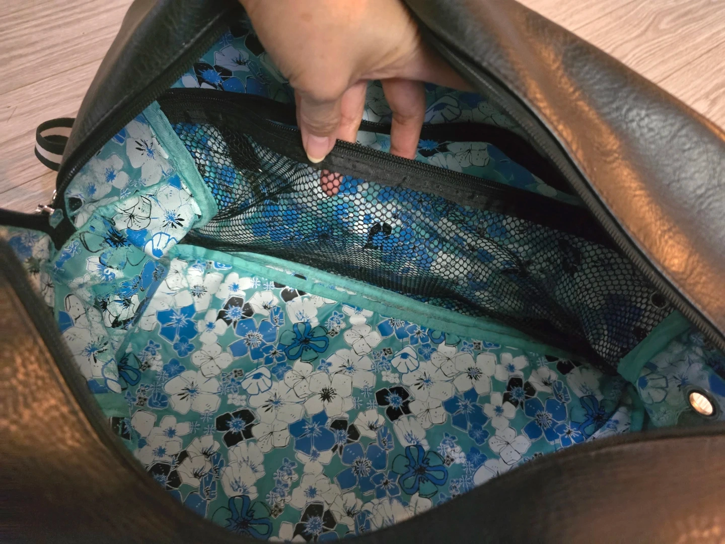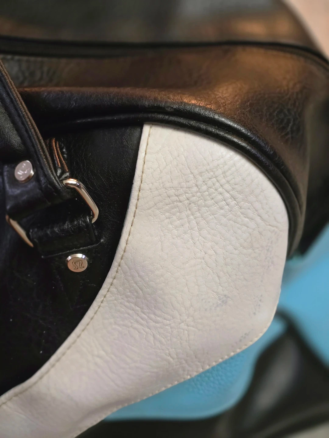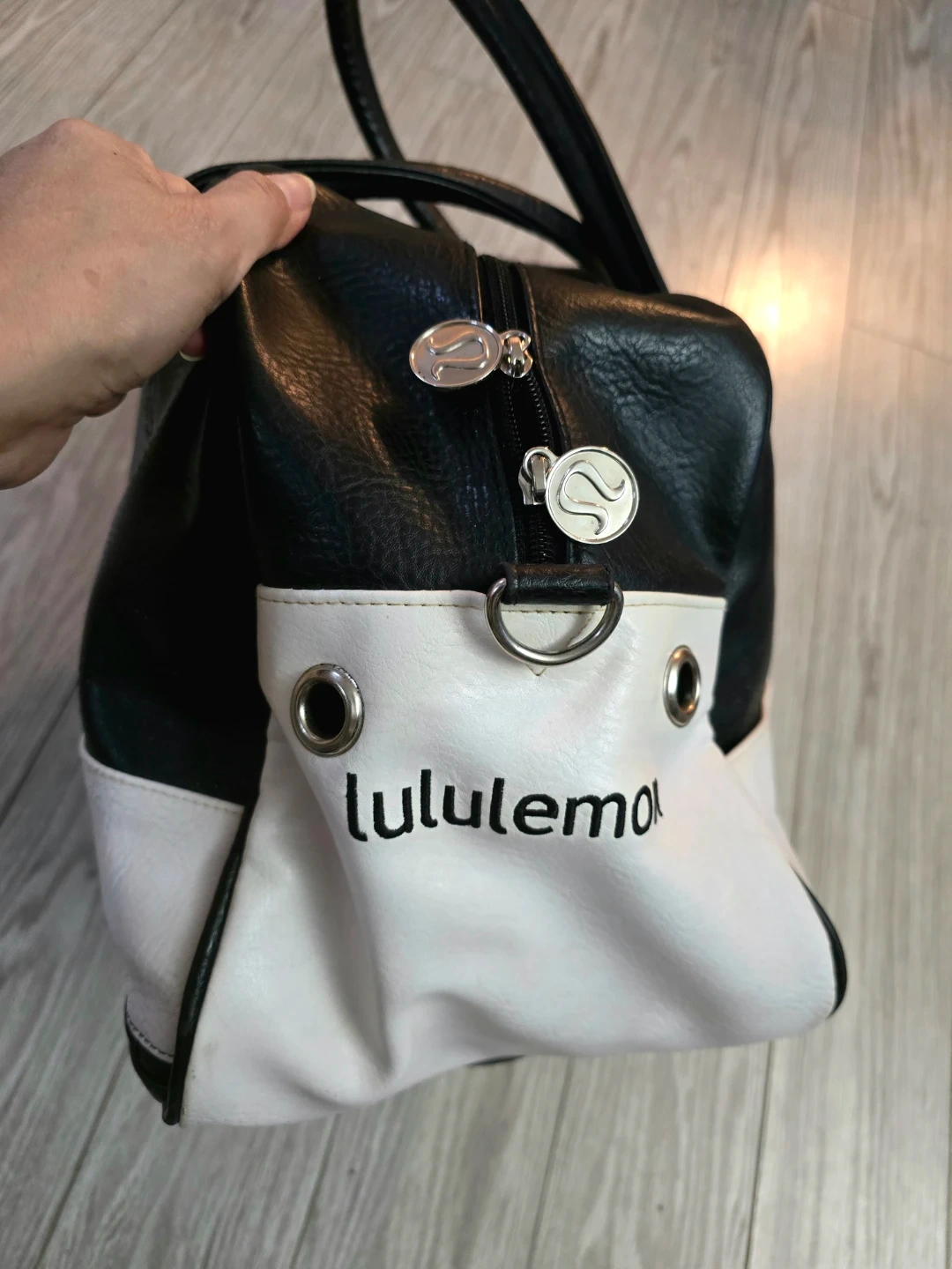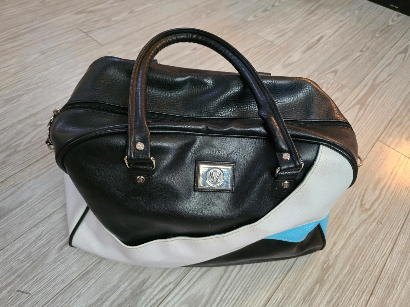 This Lululemon duffle bag has a black, white, and blue colourway. It's made of leather. It's a great size for gym sessions or weekend trips!