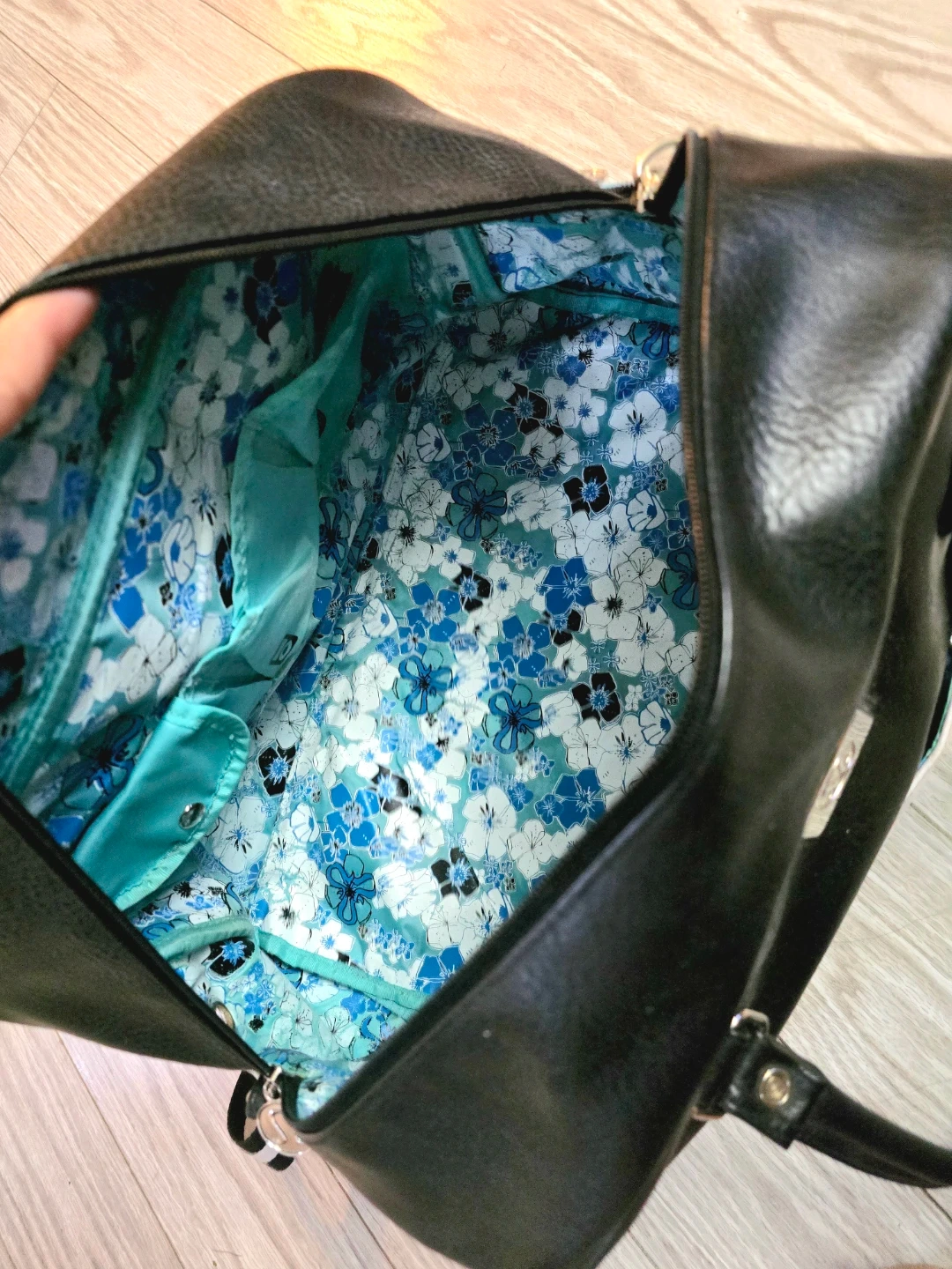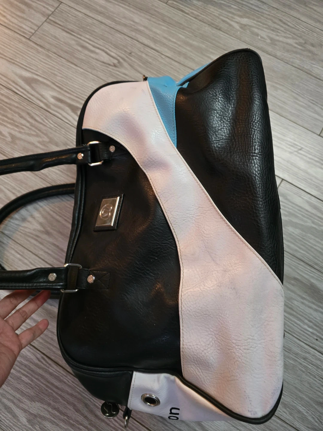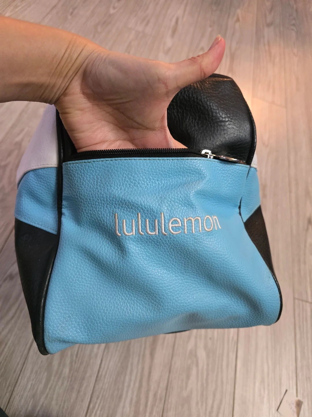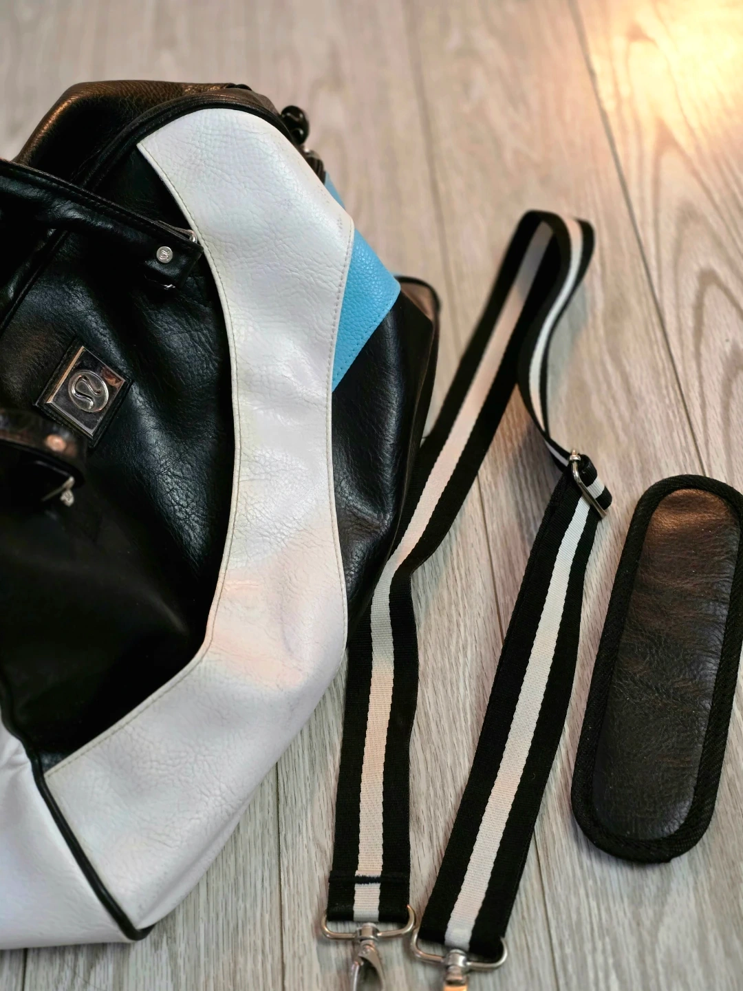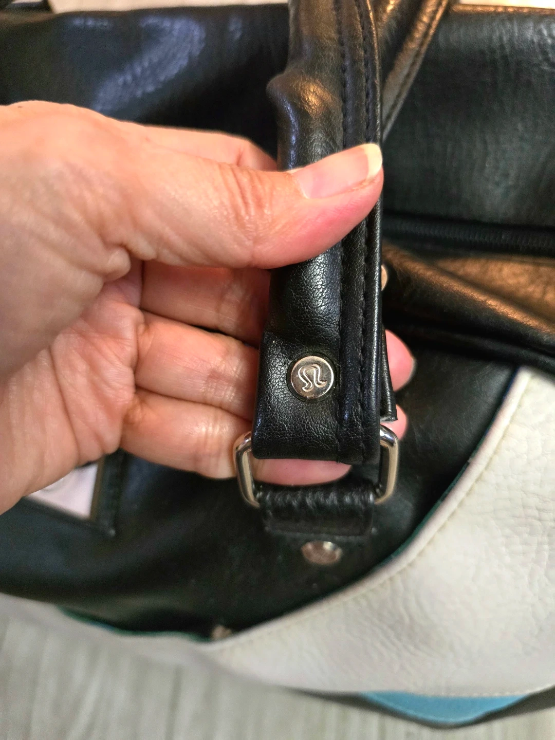 This Lululemon duffle bag has a black, white, and blue colourway. It's made of leather. It's a great size for gym sessions or weekend trips!