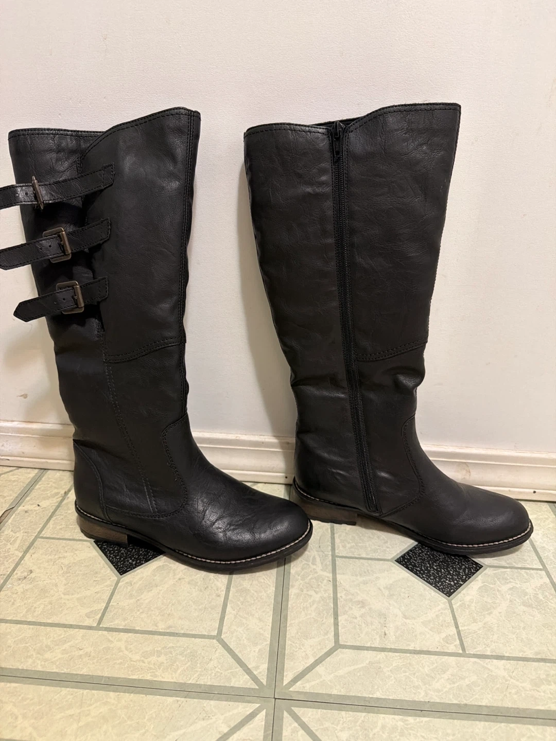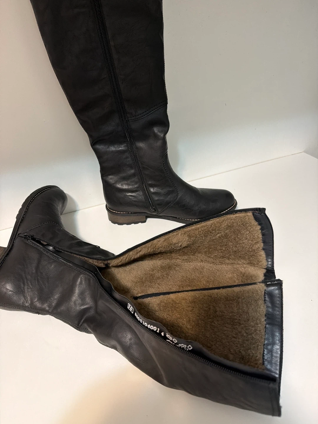 These black knee-high boots are lined with cozy lambs wool. They feature decorative buckles on the side and a full-length zipper for easy on and off. These boots are durable and stylish. Made in Vietnam.