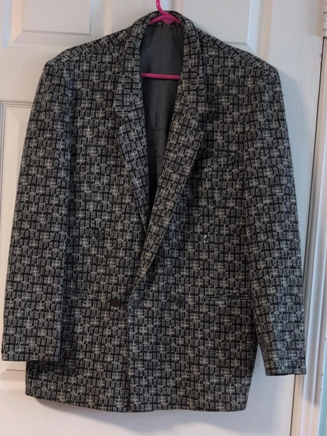 This is a men's double-breasted blazer with a black and grey woven pattern. It's fully lined. It's a classic cut suitable for formal or casual wear.