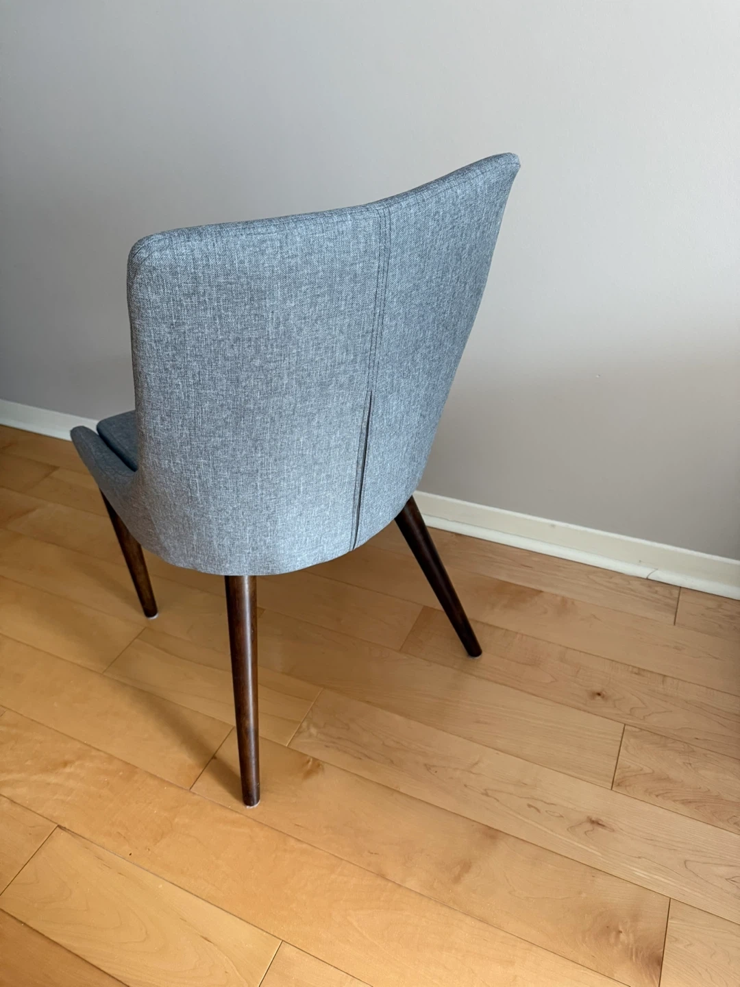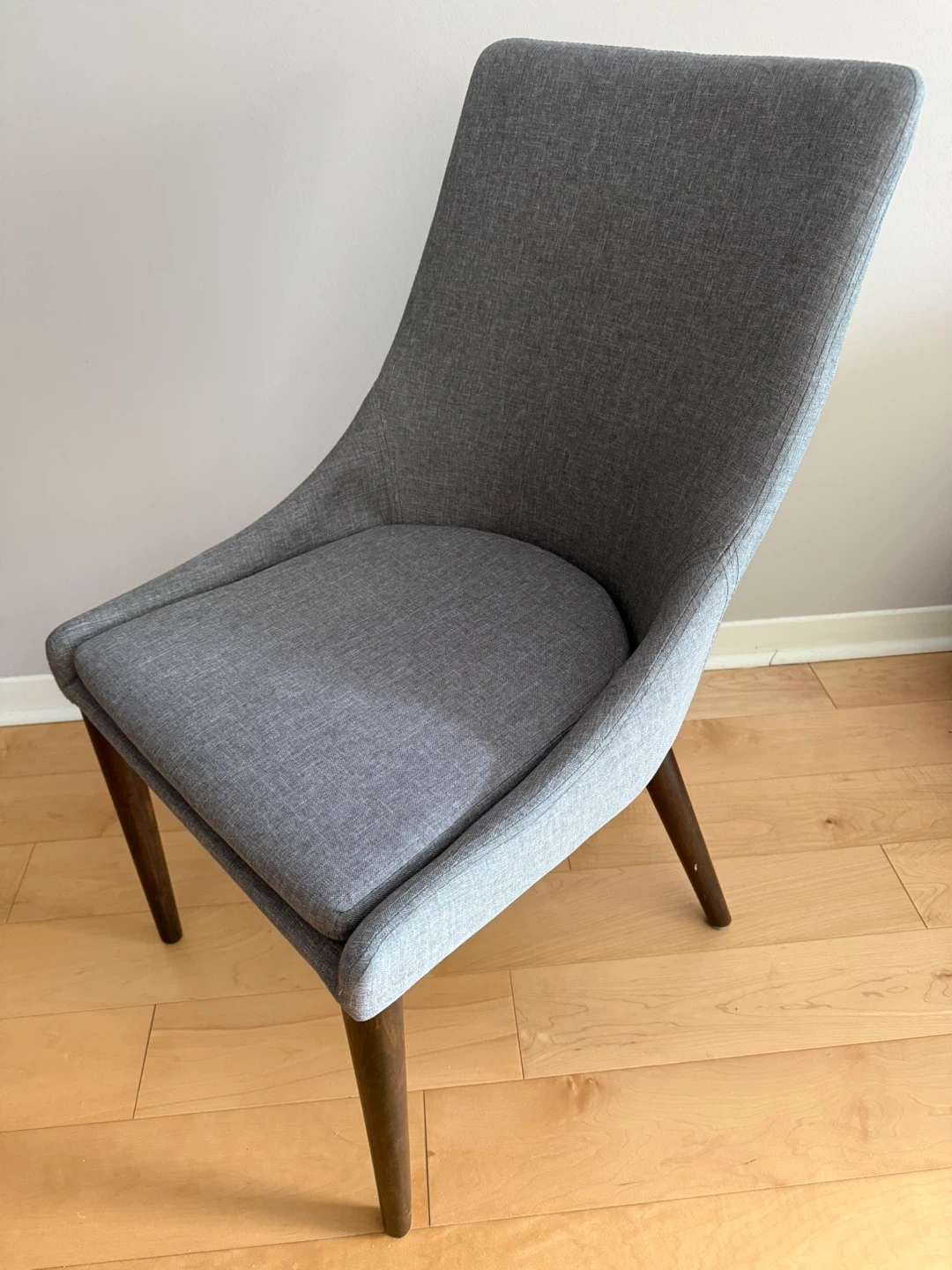 Round white dining table with four grey upholstered chairs. Table has dark wood legs. Chairs are fabric with tapered dark wood legs. A stylish set for your kitchen or dining area!