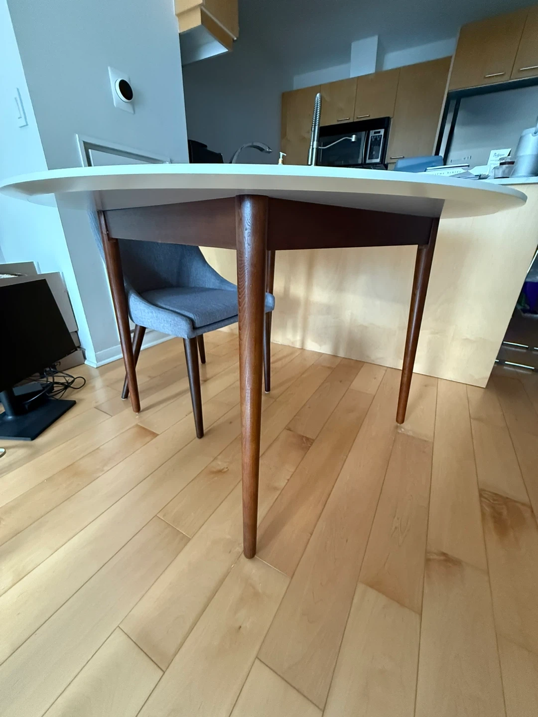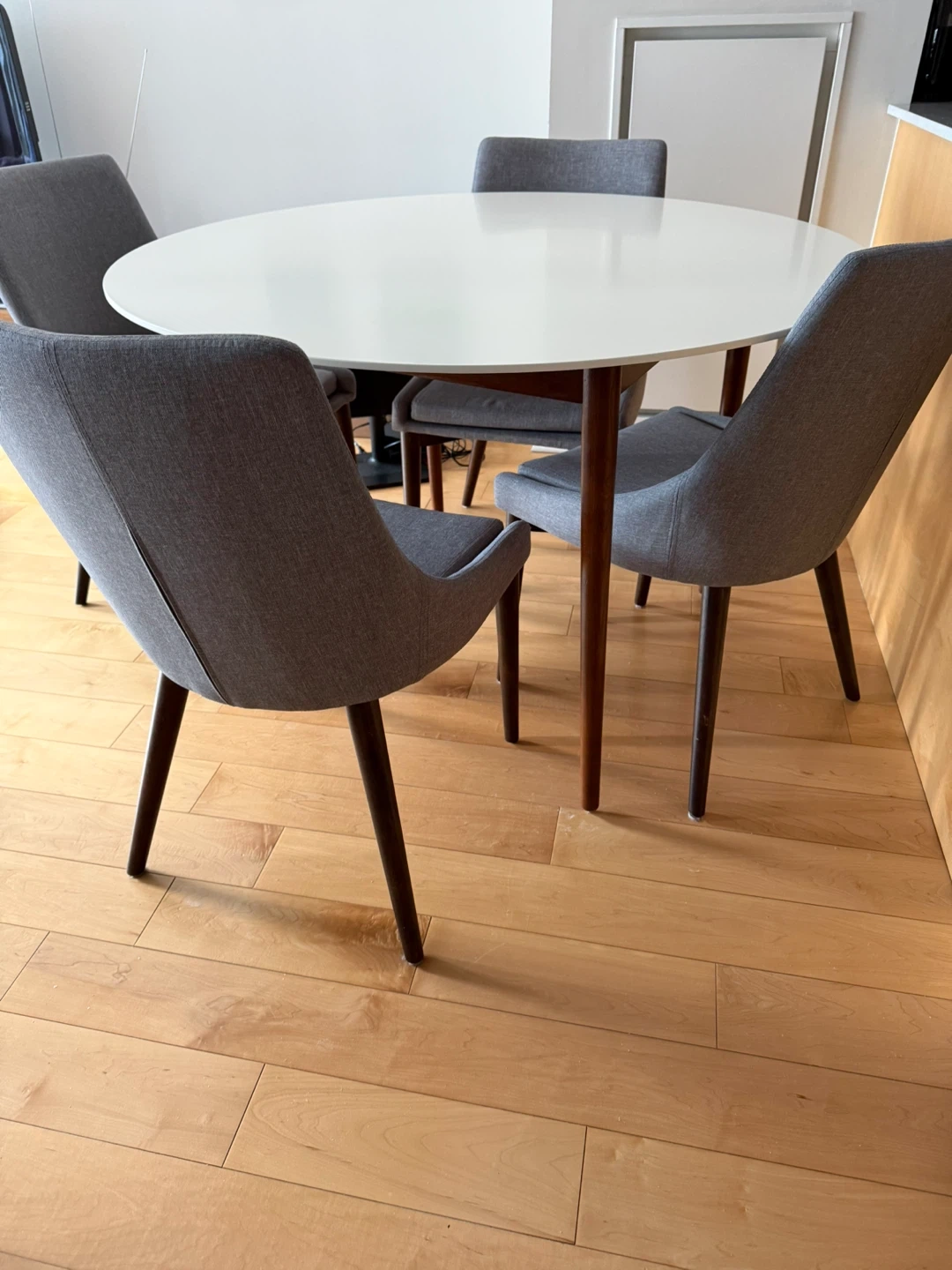 Round white dining table with four grey upholstered chairs. Table has dark wood legs. Chairs are fabric with tapered dark wood legs. A stylish set for your kitchen or dining area!