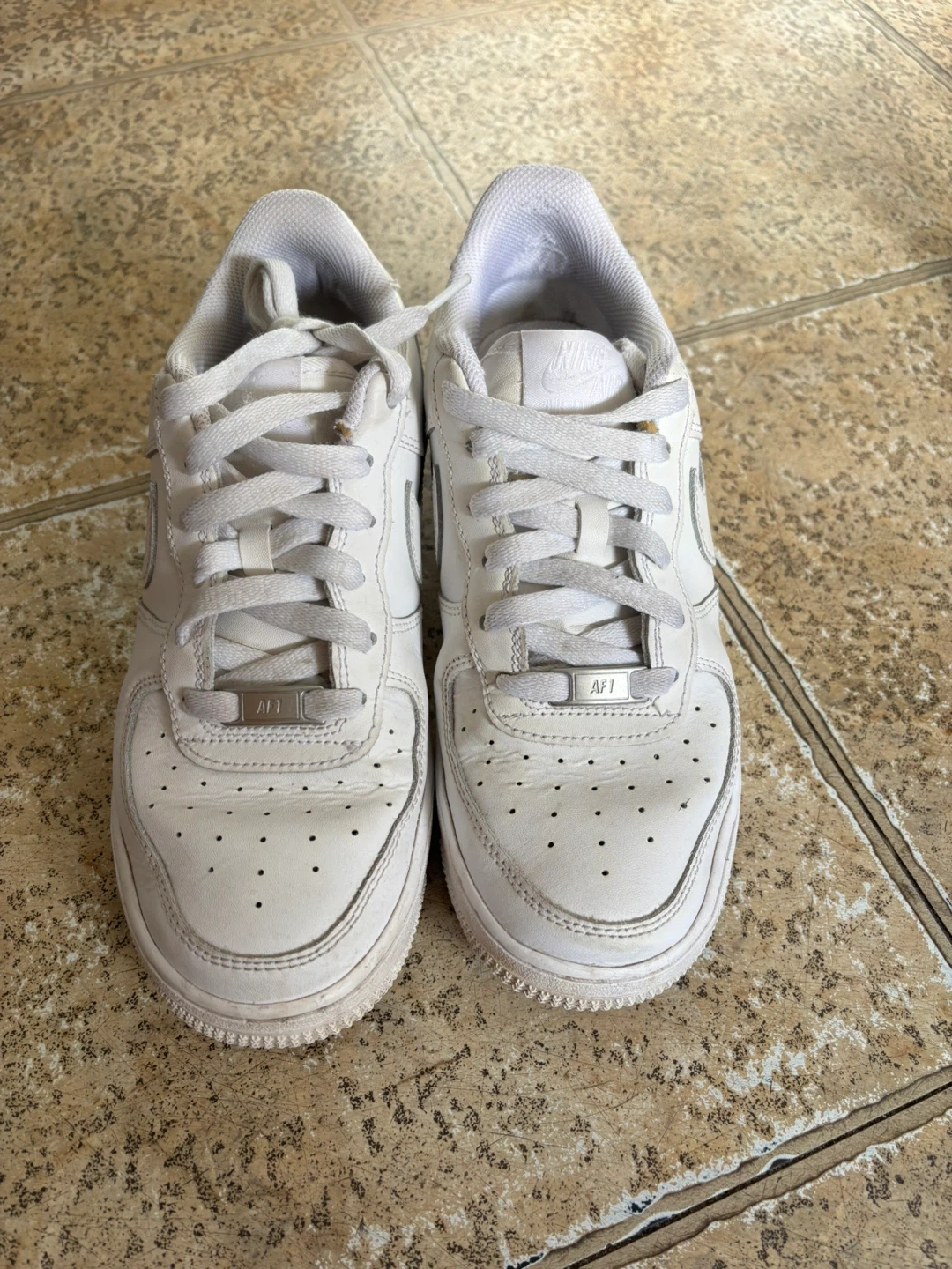 Classic white Nike Air Force 1 '07 sneakers. Leather upper with a rubber sole. UK size 5.5, US size 6Y, EU size 38.5, CM size 24.